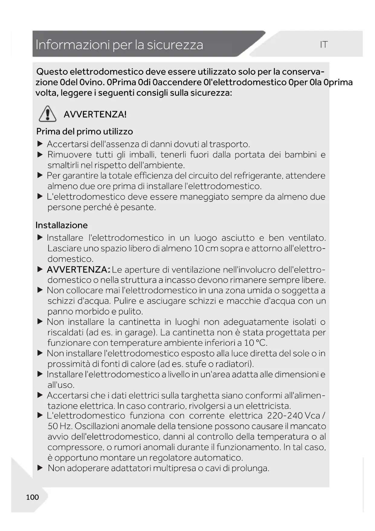 Per garantire la conservazione sicura del vino, attenersi a queste istruzioni per l'uso. f Nell'altra parte del manuale sono riport ate informazioni dettagliate sulla zona più appropriata nello scomparto dell'elettrodomestico dove conservare determinati tipi di alimenti, considerando la distribuzione della temperatura nei diversi scomparti dell'elettrodomestico. Non sono consentiti cam biamenti o modifiche all'elettrodomestico. Utilizzi errati possono causare pericoli e invalidare la garanzia.Consigli per la sicurezza