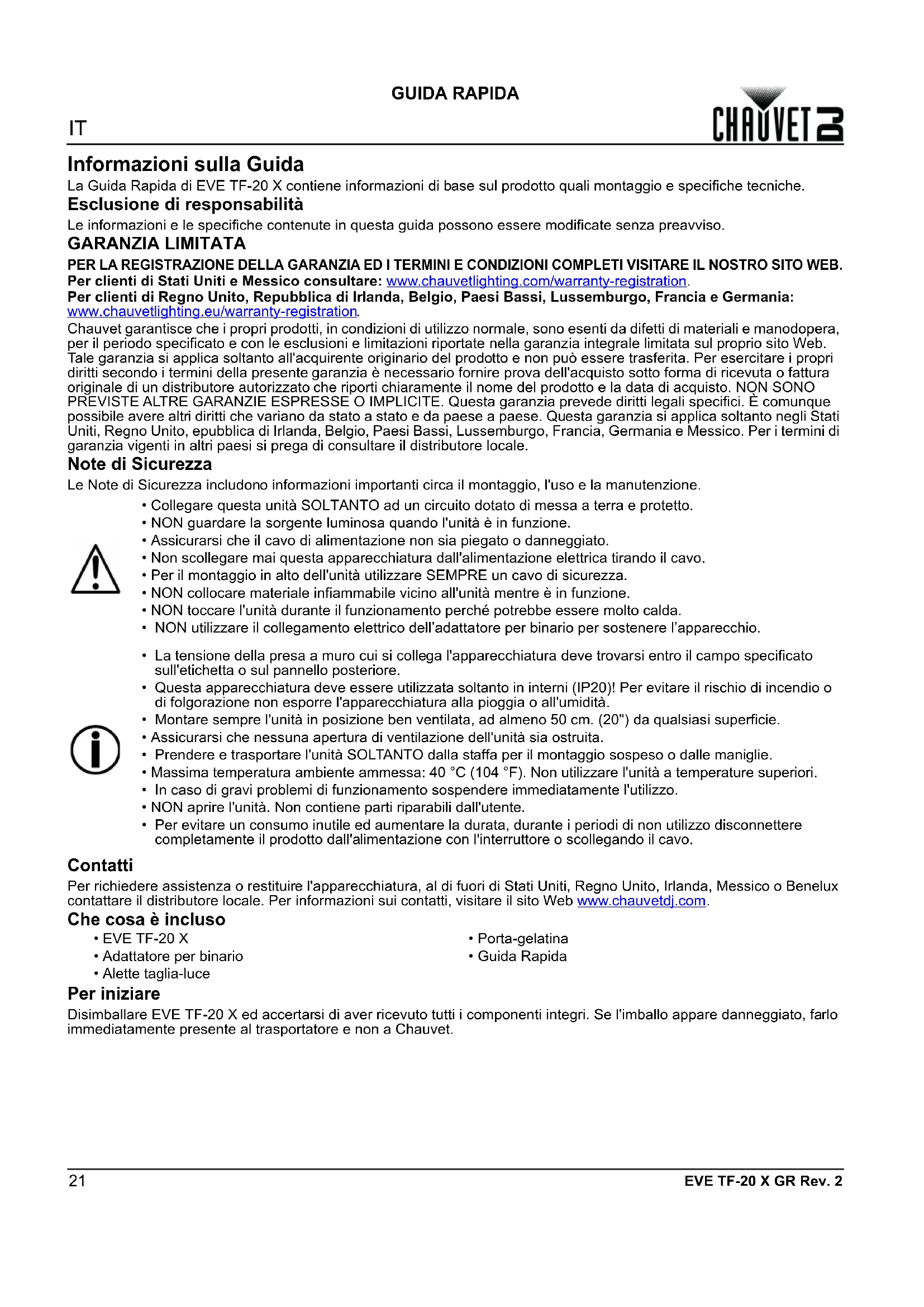 GUIDA RAPIDA EVE TF-20 X GR Rev. 2 Informazioni sulla Guida La Guida Rapida di EVE TF-20 X contiene informazioni di base sul prodotto quali montaggio e specifiche tecniche. Esclusione di responsabilità Le informazioni e le specifiche contenute in questa guida possono essere modificate senza preavviso. GARANZIA LIMITATA PER LA REGISTRAZIONE DELLA GARANZIA ED I TERMINI E CONDIZIONI COMPLETI VISITARE IL NOSTRO SITO WEB. Per clienti di Stati Uniti e Messico consultare: www.chauvetlighting.com/warranty-registration. Per clienti di Regno Unito, Repubblica di Irlanda, Belgio, Paesi Bassi, Lussemburgo, Francia e Germania: www.chauvetlighting.eu/warranty-registration