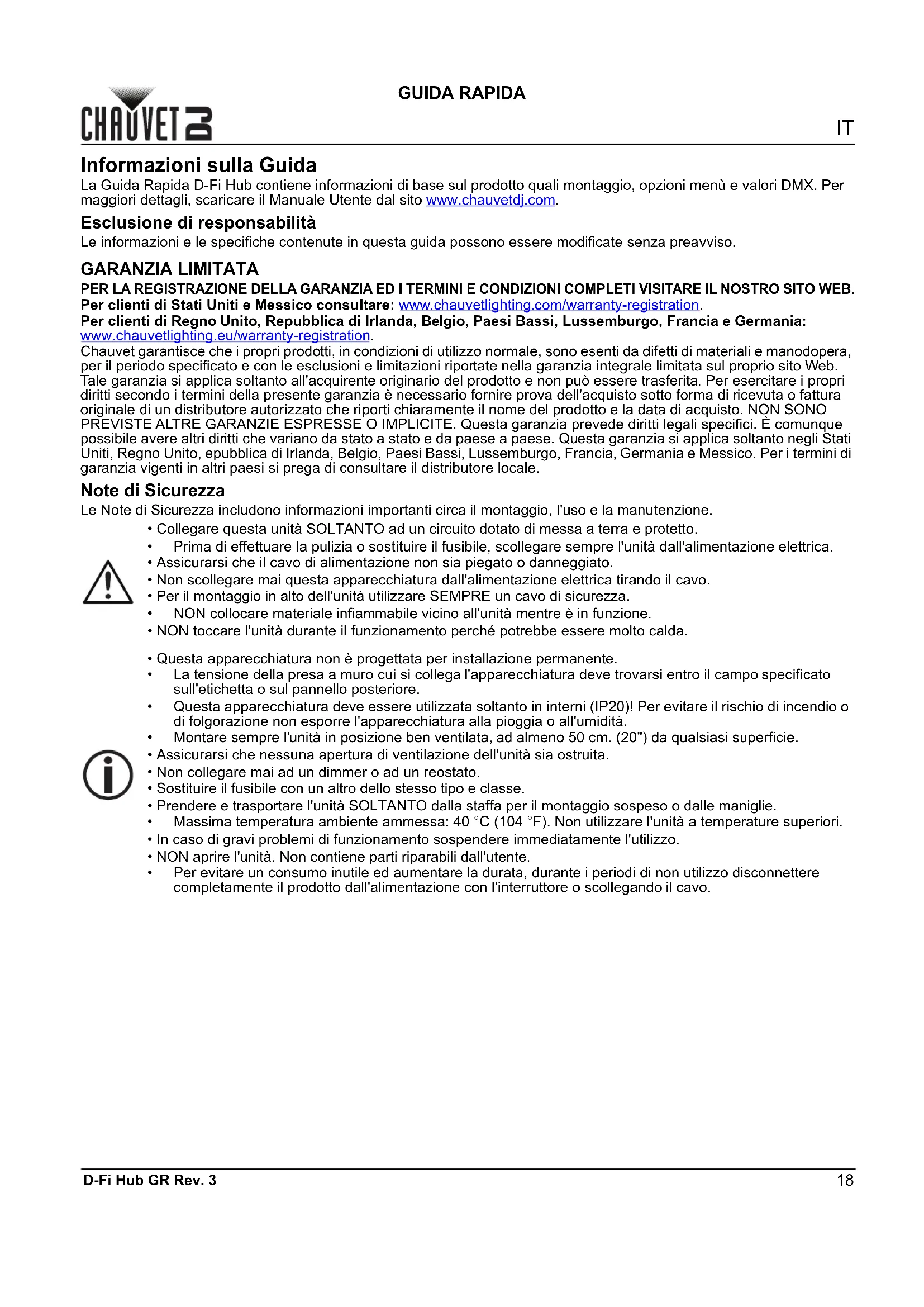 Chauvet garantisce che i propri prodotti, in condizioni di utilizzo normale, sono esenti da difetti di materiali e manodopera, per il periodo specificato e con le esclusioni e limitazioni riportate nella garanzia integrale limitata sul proprio sito Web. Tale garanzia si applica soltanto all'acquirente originario del prodotto e non può essere trasferita. Per esercitare i propri diritti secondo i termini della presente garanzia è necessario fornire prova dell'acquisto sotto forma di ricevuta o fattura originale di un distributore autorizzato che riporti chiaramente il nome del prodotto e la data di acquisto. NON SONO PREVISTE ALTRE GARANZIE ESPRESSE O IMPLICITE. Questa garanzia prevede diritti legali specifici. È comunque possibile avere altri diritti che variano da stato a stato e da paese a paese. Questa garanzia si applica soltanto negli Stati Uniti, Regno Unito, epubblica di Irlanda, Belgio, Paesi Bassi, Lussemburgo, Francia, Germania e Messico. Per i termini di garanzia vigenti in altri paesi si prega di consultare il distributore locale. Note di Sicurezza Le Note di Sicurezza includono informazioni importanti circa il montaggio, l'uso e la manutenzione.