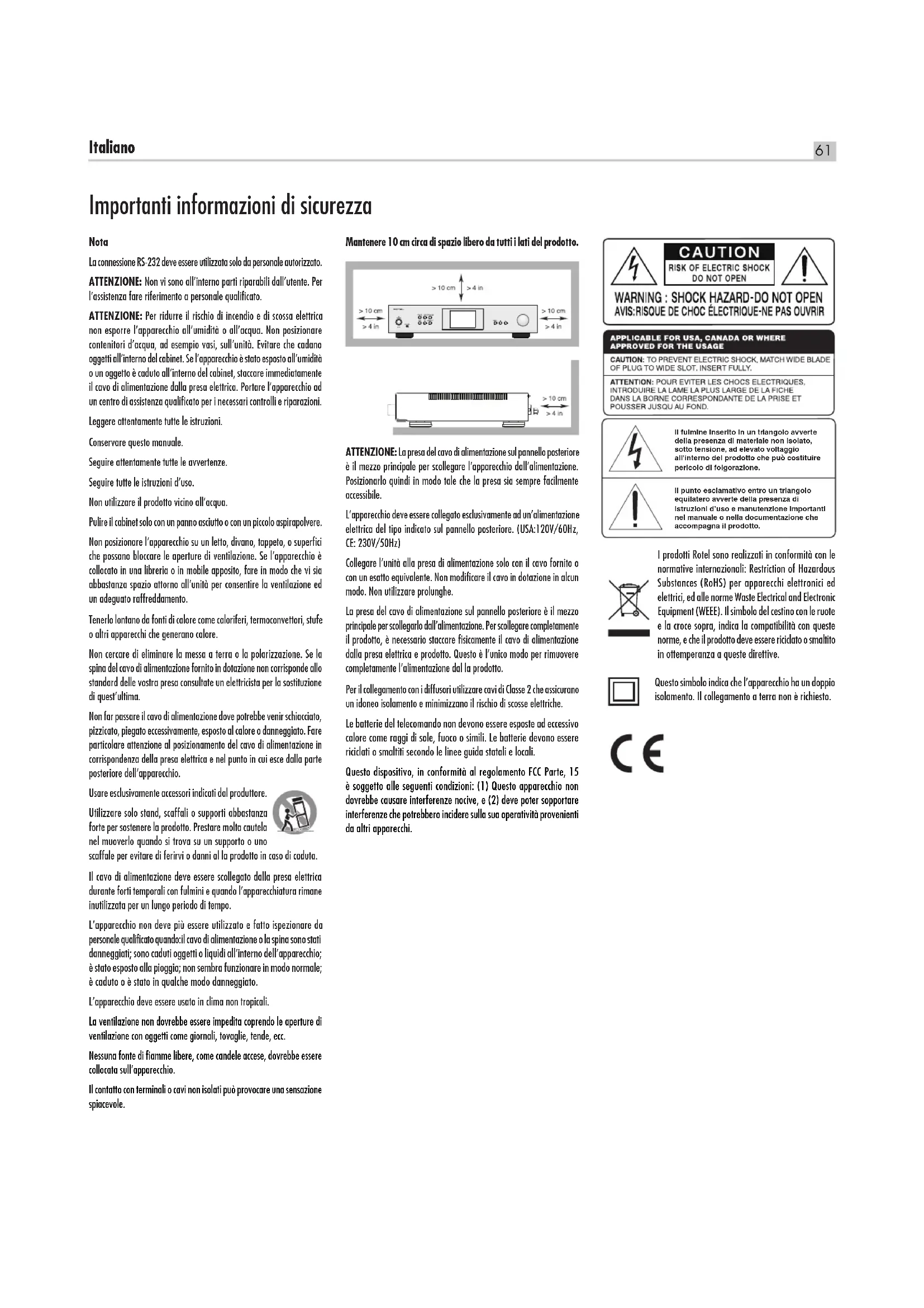 - /8”. Gewicht Gewicht (netto) 9,15 kg Alle specicaties zijn correct bij het ter perse gaan. Rotel behoudt zich het recht voor zonder voorafgaande kennisgeving verbeteringen door te voeren. Rotel en het Rotel Hi-Fi-logo zijn gedeponeerde handelsmerken van The Rotel Co, Ltd., Tokio, Japan. “Made for iPod” en “Made for iPhone” betekent dat een elektronisch accessoire speciek is ontworpen voor aansluiting op respectievelijk een iPod of een iPhone en dat door de ontwikkelaar is verklaard dat aan de prestatienormen van Apple wordt voldaan. Apple is niet verantwoordelijk voor de werking van een dergelijk apparaat noch voor het al dan niet voldoen ervan aan de veiligheidsnormen en wet- en regelgeving. Let op: als dit accessoire in combinatie met een iPod of iPhone wordt gebruikt, kan dit van invloed zijn op de draadloze prestaties. iPhone, iPod, iPod classic, iPod nano en iPod touch zijn handelsmerken van Apple Inc. en geregistreerd in de Verenigde Staten en andere landen. Het gebruik van de Works with Apple-badge betekent dat een accessoire is ontworpen om speciek te werken met de technologie die in de badge wordt vermeld en door de ontwikkelaar is gecerticeerd om te voldoen aan de prestatienormen van Apple. Om deze AirPlay 2-compatibele luidspreker te bedienen, is iOS 11.4 of hoger vereist. Apple, AirPlay, Apple TV, Apple Watch, iPad, iPad Air, iPad Pro, iPhone en Lightning zijn handelsmerken van Apple Inc., geregistreerd in de VS en andere landen. ‘MQA’ of ‘MQA Studio’ geeft aan dat het product een MQA-stream of -bestand decodeert en afspeelt, en geeft de herkomst aan om ervoor te zorgen dat het geluid identiek is aan dat van het bronmateriaal. ‘MQA Studio’ geeft aan dat er een MQA Studio-bestand wordt afgespeeld dat in de studio is goedgekeurd door de artiest/producent of is geverieerd door de eigenaar van het auteursrecht. ‘OFS’ bevestigt dat het product een MQA-stream of -bestand ontvangt. Dit levert de laatste ontvouwing van het MQA-bestand en geeft de originele samplefrequentie weer.61 Italiano Mantenere 10 cm circa di spazio libero da tutti i lati del prodotto. ATTENZIONE: La presa del cavo di alimentazione sul pannello posteriore è il mezzo principale per scollegare l’apparecchio dall’alimentazione. Posizionarlo quindi in modo tale che la presa sia sempre facilmente accessibile. L’apparecchio deve essere collegato esclusivamente ad un’alimentazione elettrica del tipo indicato sul pannello posteriore. (USA:120V/60Hz, CE: 230V/50Hz) Collegare l’unità alla presa di alimentazione solo con il cavo fornito o con un esatto equivalente. Non modificare il cavo in dotazione in alcun modo. Non utilizzare prolunghe. La presa del cavo di alimentazione sul pannello posteriore è il mezzo principale per scollegarlo dall’alimentazione. Per scollegare completamente il prodotto, è necessario staccare fisicamente il cavo di alimentazione dalla presa elettrica e prodotto. Questo è l’unico modo per rimuovere completamente l’alimentazione dal la prodotto. Per il collegamento con i diffusori utilizzare cavi di Classe 2 che assicurano un idoneo isolamento e minimizzano il rischio di scosse elettriche. Le batterie del telecomando non devono essere esposte ad eccessivo calore come raggi di sole, fuoco o simili. Le batterie devono essere riciclati o smaltiti secondo le linee guida statali e locali. Questo dispositivo, in conformità al regolamento FCC Parte, 15 è soggetto alle seguenti condizioni: (1) Questo apparecchio non dovrebbe causare interferenze nocive, e (2) deve poter sopportare interferenze che potrebbero incidere sulla sua operatività provenienti da altri apparecchi. Nota La connessione RS-232 deve essere utilizzata solo da personale autorizzato. ATTENZIONE: Non vi sono all’interno parti riparabili dall’utente. Per l’assistenza fare riferimento a personale qualificato. ATTENZIONE: Per ridurre il rischio di incendio e di scossa elettrica non esporre l’apparecchio all’umidità o all’acqua. Non posizionare contenitori d’acqua, ad esempio vasi, sull’unità. Evitare che cadano oggetti all’interno del cabinet. Se l’apparecchio è stato esposto all’umidità o un oggetto è caduto all’interno del cabinet, staccare immediatamente il cavo di alimentazione dalla presa elettrica. Portare l’apparecchio ad un centro di assistenza qualificato per i necessari controlli e riparazioni. Leggere attentamente tutte le istruzioni. Conservare questo manuale. Seguire attentamente tutte le avvertenze. Seguire tutte le istruzioni d’uso. Non utilizzare il prodotto vicino all’acqua. Pulire il cabinet solo con un panno asciutto o con un piccolo aspirapolvere. Non posizionare l’apparecchio su un letto, divano, tappeto, o superfici che possano bloccare le aperture di ventilazione. Se l’apparecchio è collocato in una libreria o in mobile apposito, fare in modo che vi sia abbastanza spazio attorno all’unità per consentire la ventilazione ed un adeguato raffreddamento. Tenerlo lontano da fonti di calore come caloriferi, termoconvettori, stufe o altri apparecchi che generano calore. Non cercare di eliminare la messa a terra o la polarizzazione. Se la spina del cavo di alimentazione fornito in dotazione non corrisponde allo standard delle vostra presa consultate un elettricista per la sostituzione di quest’ultima. Non far passare il cavo di alimentazione dove potrebbe venir schiacciato, pizzicato, piegato eccessivamente, esposto al calore o danneggiato. Fare particolare attenzione al posizionamento del cavo di alimentazione in corrispondenza della presa elettrica e nel punto in cui esce dalla parte posteriore dell’apparecchio. Usare esclusivamente accessori indicati dal produttore. Utilizzare solo stand, scaffali o supporti abbastanza forte per sostenere la prodotto. Prestare molta cautela nel muoverlo quando si trova su un supporto o uno scaffale per evitare di ferirvi o danni al la prodotto in caso di caduta. Il cavo di alimentazione deve esser