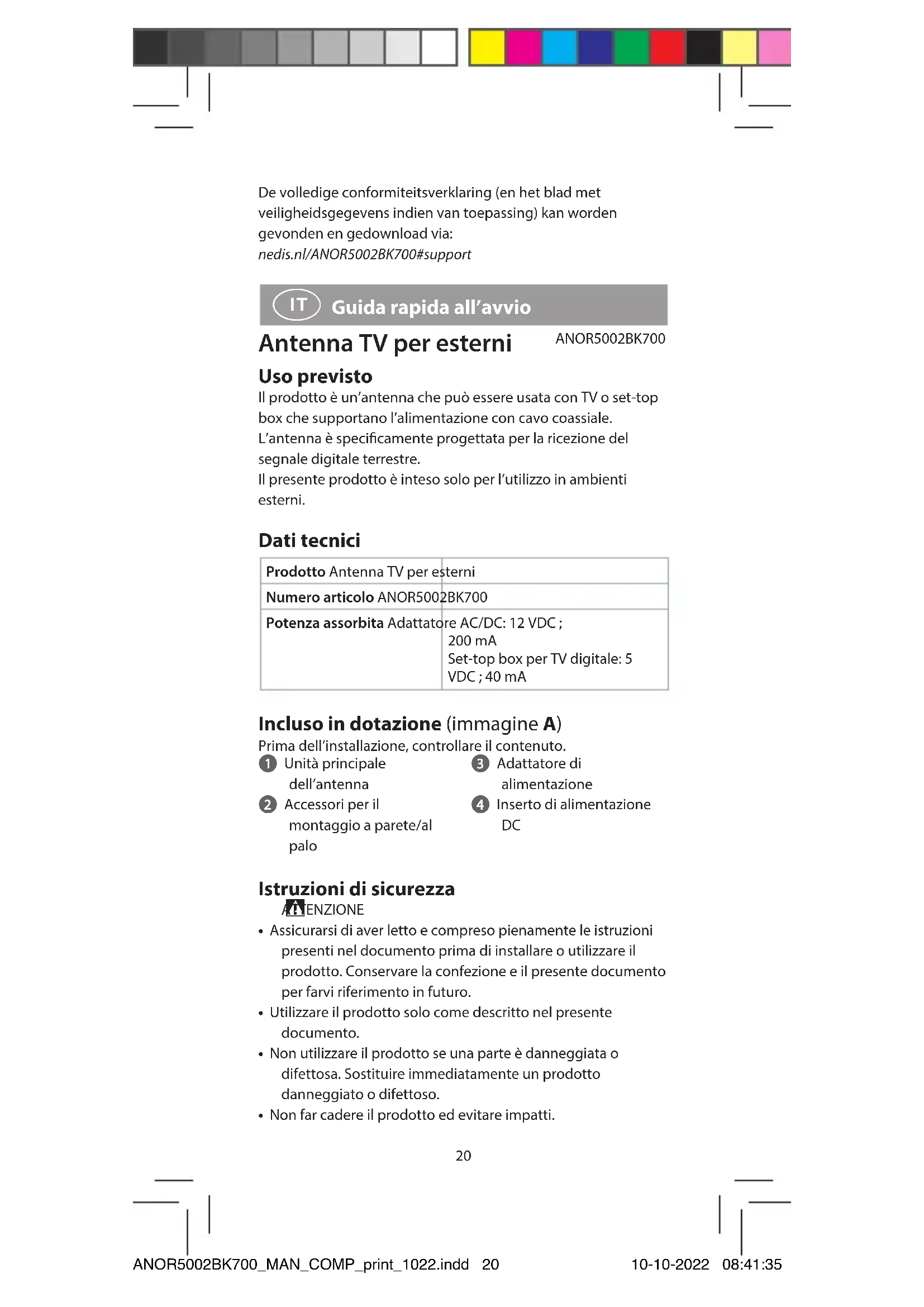 Guida rapida all’avvio Antenna TV per esterni ANOR5002BK700 Uso previsto Il prodotto è un’antenna che può essere usata con TV o set-top box che supportano l’alimentazione con cavo coassiale.L’antenna è specicamente progettata per la ricezione del segnale digitale terrestre.Il presente prodotto è inteso solo per l’utilizzo in ambienti esterni. Dati tecnici Prodotto Antenna TV per esterniNumero articolo ANOR5002BK700Potenza assorbita Adattatore AC/DC: 12 VDC ; 200 mASet-top box per TV digitale: 5 VDC ; 40 mA Incluso in dotazione (immagine A) Prima dell’installazione, controllare il contenuto. 1 Unità principale dell’antenna 2 Accessori per il montaggio a parete/al palo 3 Adattatore di alimentazione 4 Inserto di alimentazione