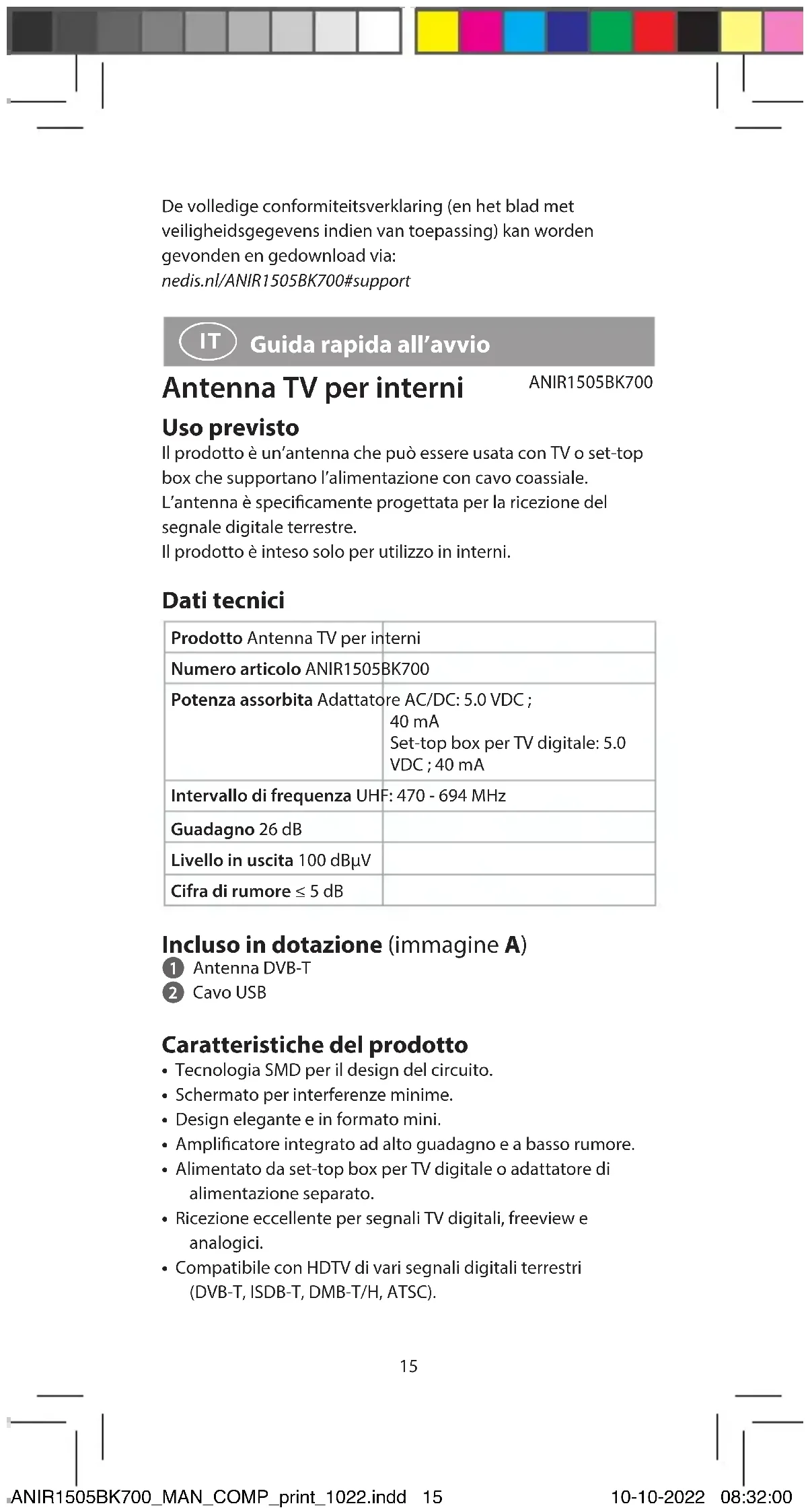 Scarica le istruzioni per il tuo Antenna TV in formato PDF gratuitamente! Trova il tuo manuale ANIR1505BK700 - NEDIS e riprendi in mano il tuo dispositivo elettronico. In questa pagina sono pubblicati tutti i documenti necessari per l'utilizzo del tuo dispositivo. ANIR1505BK700 del marchio NEDIS.