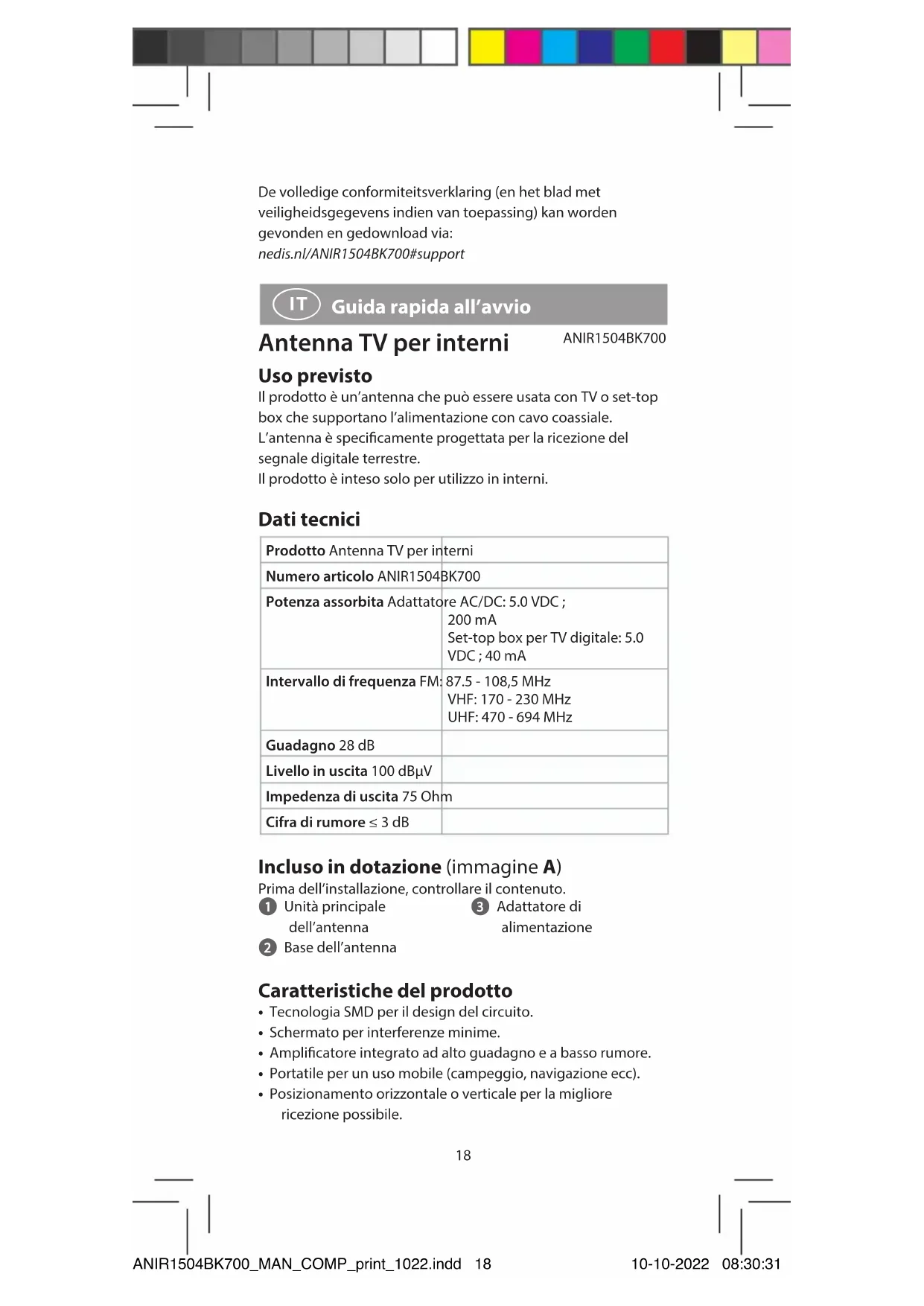 Guida rapida all’avvio Antenna TV per interni ANIR1504BK700 Uso previsto Il prodotto è un’antenna che può essere usata con TV o set-top box che supportano l’alimentazione con cavo coassiale. L’antenna è specicamente progettata per la ricezione del segnale digitale terrestre. Il prodotto è inteso solo per utilizzo in interni. Dati tecnici Prodotto Antenna TV per interni Numero articolo ANIR1504BK700 Potenza assorbita Adattatore AC/DC: 5.0 VDC ; 200 mA Set-top box per TV digitale: 5.0 VDC ; 40 mA Intervallo di frequenza FM: 87.5 - 108,5 MHz VHF: 170 - 230 MHz UHF: 470 - 694 MHz Guadagno 28 dB Livello in uscita 100 dBµV Impedenza di uscita 75 Ohm Cifra di rumore ≤ 3 dB Incluso in dotazione (immagine A) Prima dell’installazione, controllare il contenuto. 1 Unità principale dell’antenna 2 Base dell’antenna 3 Adattatore di alimentazione Caratteristiche del prodotto