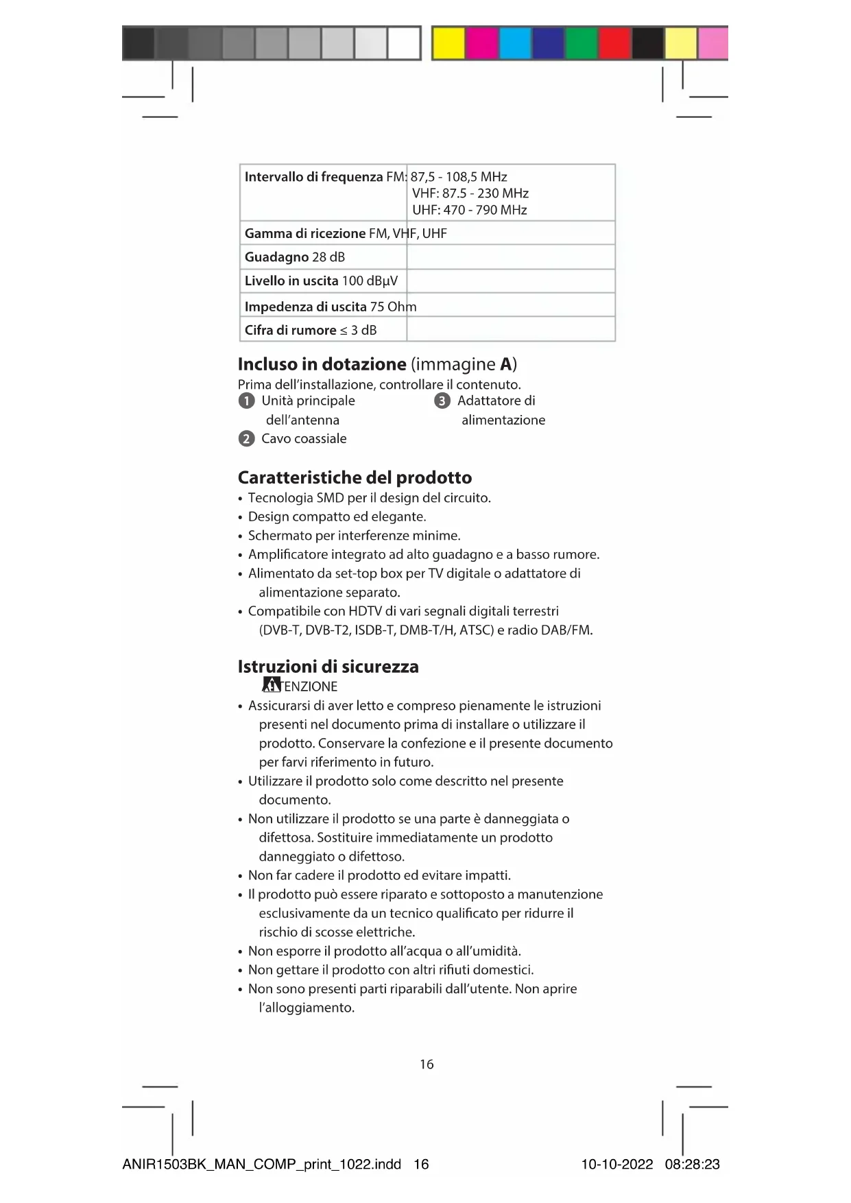 Guida rapida all’avvio Antenna TV per interni ANIR1503BK Uso previsto Il prodotto è un’antenna che può essere usata con TV o set-top box che supportano l’alimentazione con cavo coassiale. L’antenna è specicamente progettata per la ricezione del segnale digitale terrestre. Il prodotto è inteso solo per utilizzo in interni. Dati tecnici Prodotto Antenna TV per interni Numero articolo ANIR1503BK Potenza assorbita Adattatore AC/DC: 5.0 VDC ; 200 mA Set-top box per TV digitale: 5.0 VDC ; 40 mA ANIR1503BK_MAN_COMP_print_1022.indd 15ANIR1503BK_MAN_COMP_print_1022.indd 15 10-10-2022 08:28:2310-10-2022 08:28:2316 Intervallo di frequenza FM: 87,5 - 108,5 MHz VHF: 87.5 - 230 MHz UHF: 470 - 790 MHz Gamma di ricezione FM, VHF, UHF Guadagno 28 dB Livello in uscita 100 dBµV Impedenza di uscita 75 Ohm Cifra di rumore ≤ 3 dB Incluso in dotazione (immagine A) Prima dell’installazione, controllare il contenuto. 1 Unità principale dell’antenna 2 Cavo coassiale 3 Adattatore di alimentazione Caratteristiche del prodotto