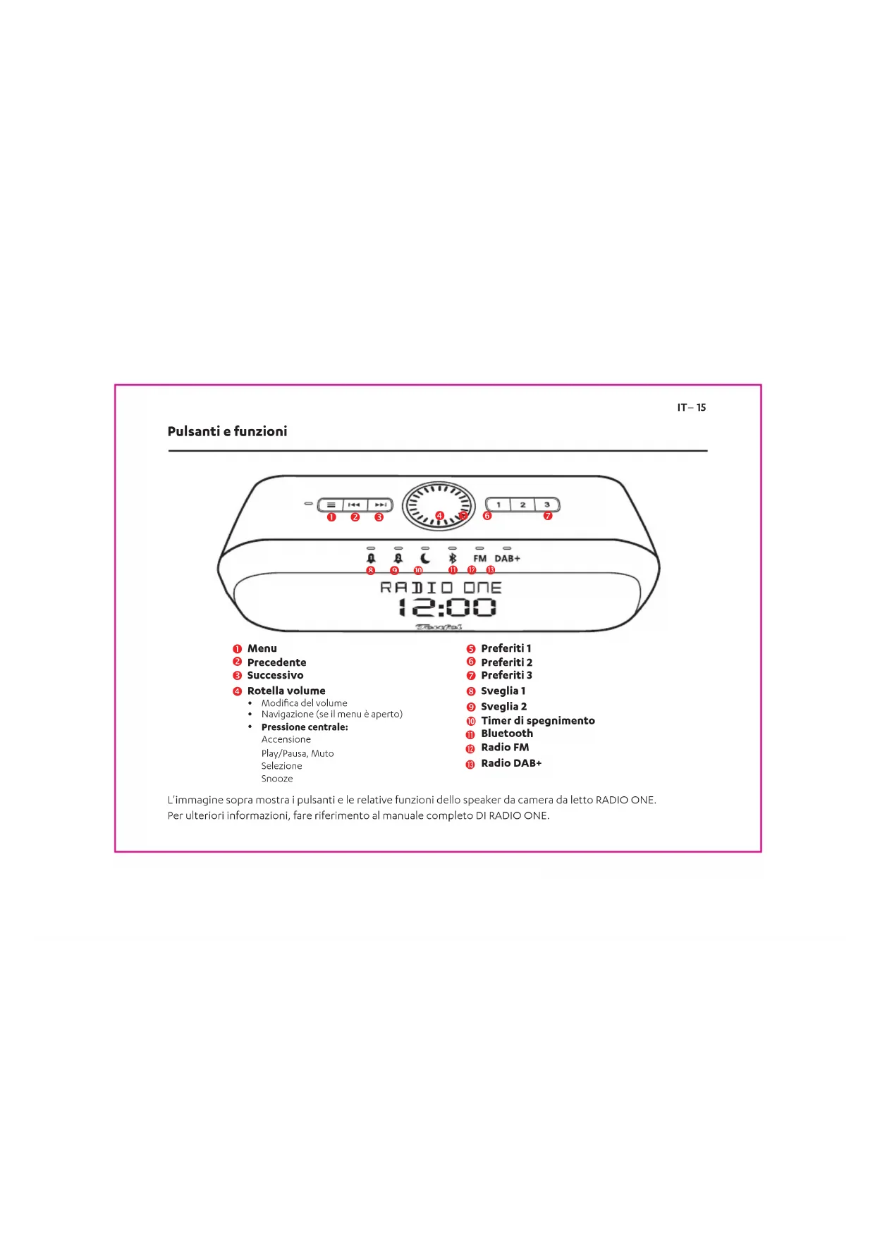 Navigazione (se il menu è aperto) Accensione Play/Pausa, Muto Selezione Snooze Pressione centrale: IT– 15