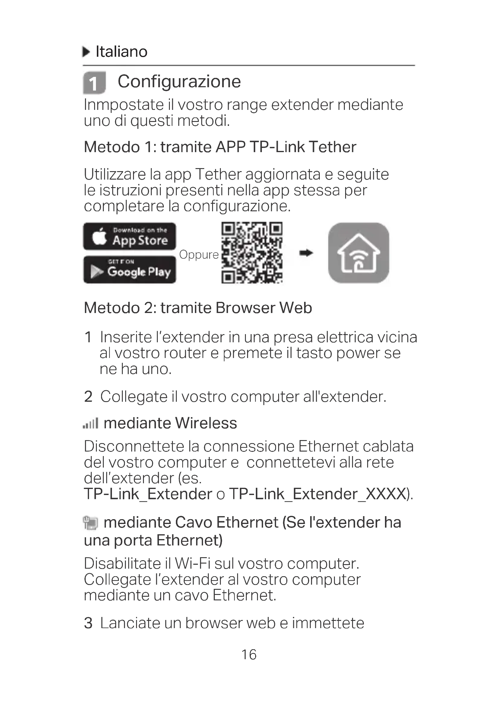 Configurazione Inmpostate il vostro range extender mediante uno di questi metodi. Metodo 1: tramite APP TP-Link Tether Utilizzare la app Tether aggiornata e seguite le istruzioni presenti nella app stessa per completare la configurazione. Metodo 2: tramite Browser Web 1 Inserite l’extender in una presa elettrica vicina al vostro router e premete il tasto power se ne ha uno. 2 Collegate il vostro computer all'extender. mediante Wireless Disconnettete la connessione Ethernet cablata del vostro computer e connettetevi alla rete dell’extender (es. TP-Link_Extender o TP-Link_Extender_XXXX). mediante Cavo Ethernet (Se l'extender ha una porta Ethernet) Disabilitate il Wi-Fi sul vostro computer. Collegate l’extender al vostro computer mediante un cavo Ethernet. 3 Lanciate un browser web e immettete OppureItaliano