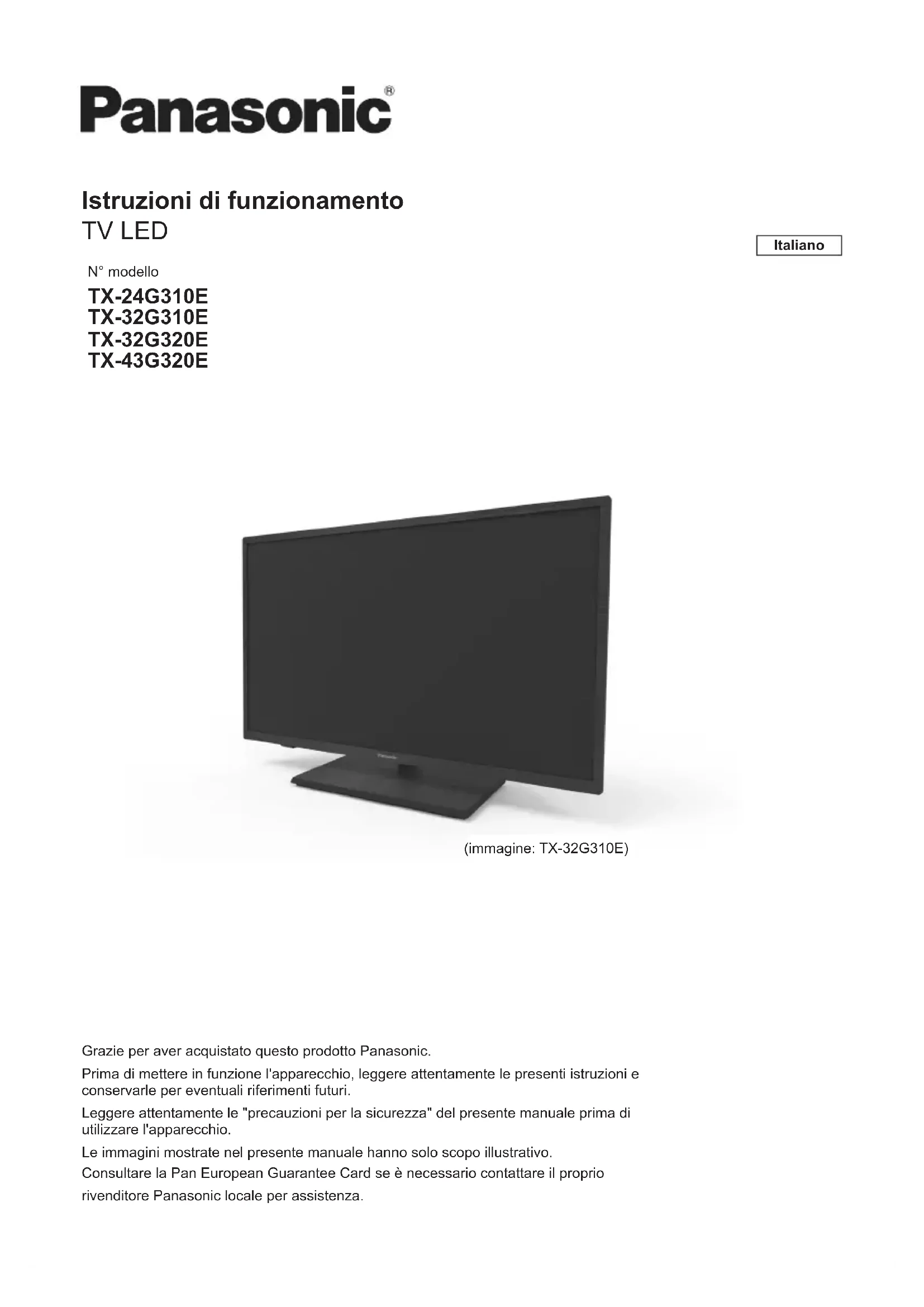 Contattare il proprio rivenditore Panasonic locale per ricevere assistenza. Se si richiede assistenza da un Paese che non supporta questa televisione, non possiamo rispondere in merito a contenuti che richiedono una conferma visiva per i collegamenti, comportamenti e altri aspetti della televisione stessa.33 Italiano Manutenzione Per prima cosa, scollegare la presa di alimentazione dalla presa di corrente. Display, mobiletto, piedistallo Pulizia periodica:Pulire delicatamente la superficie del display, del mobiletto o del piedistallo utilizzando un panno morbido per rimuovere sporcizia o impronte.Per lo sporco più ostinato:(1) Per prima cosa, rimuovere la polvere dalla superficie.(2) Inumidire un panno morbido con acqua pulita o detergente neutro diluito (1 parte di detergente per 100 parti di acqua).(3) Strizzare bene il panno. (Non lasciare che il liquido entri all'interno della televisione poiché potrebbe causare il malfunzionamento dell'apparecchio).(4) Pulire accuratamente e strofinare rimuovendo lo sporco più ostinato.(5) Alla fine, rimuovere tutta l'umidità.Attenzione Non utilizzare un panno ruvido e non strofinare la superficie con troppa forza, per evitare di graffiarla. Fare attenzione a non applicare sulle superfici sostanze repellenti per insetti, solventi, diluenti o altre sostanze volatili. Ciò può compromettere la qualità della superficie o causare la rimozione della vernice. La superficie del display è trattata in modo particolare e può essere facilmente danneggiata. Fare attenzione a non picchiettare o graffiare la superficie con le unghie o con altri oggetti duri. Evitare che il mobiletto e il piedistallo entrino in contatto con una sostanza in gomma o in PVC per un lungo periodo di tempo. Ciò potrebbe compromettere la qualità della superficie. Spina di alimentazione Pulire regolarmente la presa di alimentazione con un panno asciutto. L'umidità e la polvere potrebbero causare incendi o scosse elettriche. Specifiche ■ TV N° modello Modello da 24 polliciTX-24G310EModello da 32 polliciTX-32G310E TX-32G320EModello da 43 polliciTX-43G320E Dimensioni (L x A x P) Modello da 24 pollici556 mm × 393 mm × 176 mm (con piedistallo)556 mm × 344 mm × 68 mm (solo TV)Modello da 32 pollici732 mm × 487 mm × 195 mm (con piedistallo)732 mm × 438 mm × 77 mm (solo TV)Modello da 43 pollici970 mm × 617 mm × 264 mm (con piedistallo)970 mm × 567 mm × 81 mm (solo TV) Peso Modello da 24 pollici3,36 kg netti (con piedistallo)3,09 kg netti (solo TV)Modello da 32 pollici4,91 kg netti (con piedistallo)4,41 kg netti (solo TV)Modello da 43 pollici10,26 kg netti (con piedistallo)7,7 kg netti (solo TV) Sorgente di alimentazione CA 220-240 V, 50/60 Hz Display Display LED LCD Suono Uscita altoparlanteModello da 24 pollici6W (3W + 3W)Modello da 32 pollici10W (5W + 5W)Modello da 43 pollici16W (8W + 8W)Cuffie1 Mini-jack stereo da 3,5 mm34 Italiano Terminali di collegamento SCART (RGB/CVBS) Adattatore SCART Uscita HDMI 1 / 2 Connettori di tipo A HDMI 1: Tipo di contenuto, Audio Return Channel, Deep Colour, x.v.Colour™ HDMI 2: Tipo di contenuto, Deep Colour, x.v.Colour™ Slot scheda Slot di interfaccia comune (conforme a CI Plus) × 1 USB CC 5 V, max. 500 mA [collegamento USB ad alta velocità (USB 2.0)] Uscita DIGITAL AUDIO PCM / Dolby Digital, fibra ottica Sistemi di ricezione / Nome banda DVB-C Servizi digitali via cavo (MPEG2, MPEG4- AVC(H.264) and MPEG HEVC) DVB-T / T2 Servizi digitali terrestri (MPEG2, MPEG4- AVC(H.264) and MPEG HEVC)