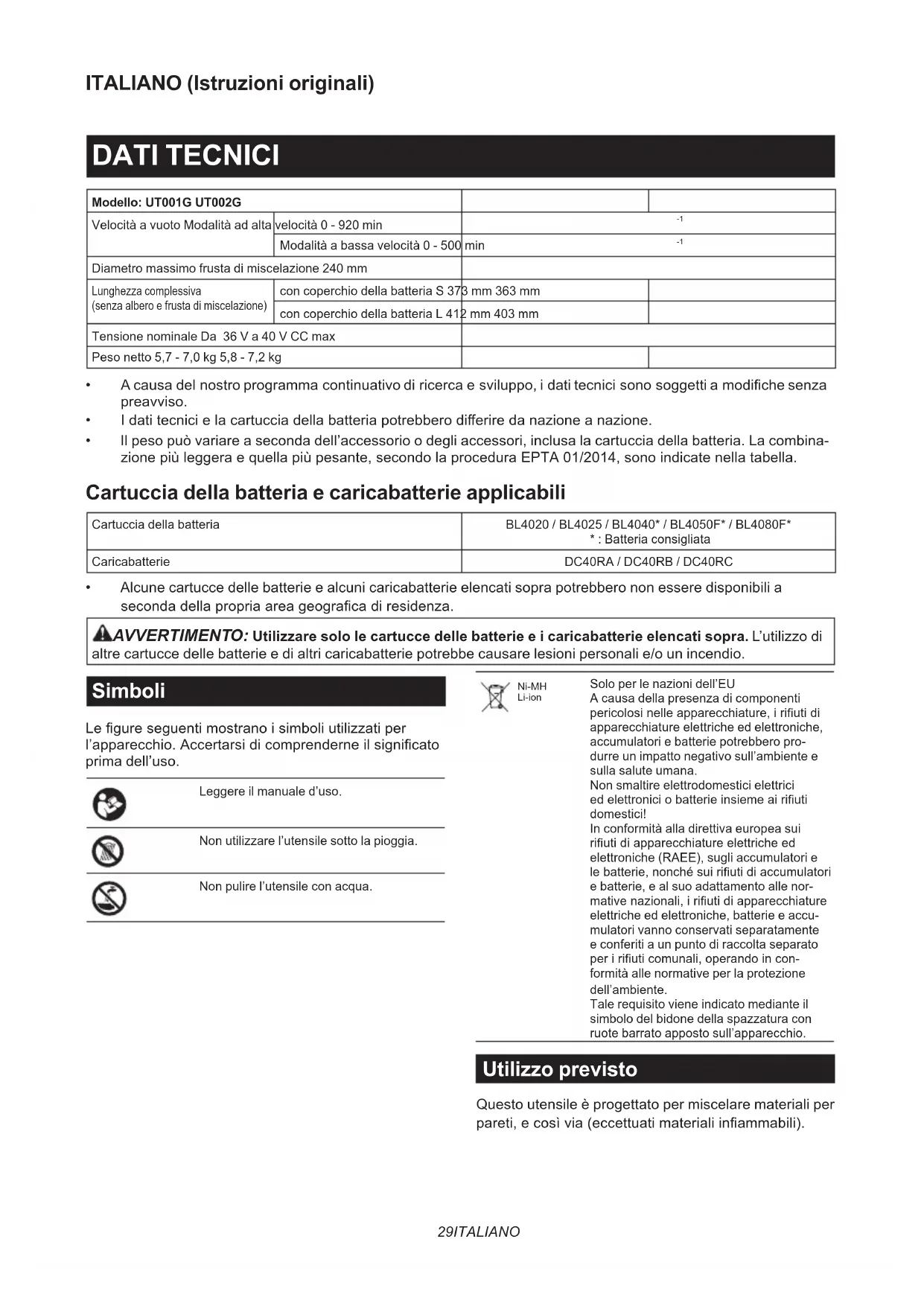 - Alcune cartucce delle batterie e alcuni caricabatterie elencati sopra potrebbero non essere disponibili a secondadellapropriaareageogracadiresidenza. AVVERTIMENTO: Utilizzare solo le cartucce delle batterie e i caricabatterie elencati sopra. L’utilizzo di altre cartucce delle batterie e di altri caricabatterie potrebbe causare lesioni personali e/o un incendio. Simboli Legureseguentimostranoisimboliutilizzatiper l’apparecchio.Accertarsidicomprenderneilsignicato prima dell’uso. Leggere il manuale d’uso. Non utilizzare l’utensile sotto la pioggia. Non pulire l’utensile con acqua. Ni-MH Li-ion Solo per le nazioni dell’EU A causa della presenza di componenti pericolosinelleapparecchiature,iriutidi apparecchiature elettriche ed elettroniche, accumulatori e batterie potrebbero pro- durre un impatto negativo sull’ambiente e sulla salute umana. Non smaltire elettrodomestici elettrici edelettroniciobatterieinsiemeairiuti domestici! In conformità alla direttiva europea sui riutidiapparecchiatureelettricheed elettroniche (RAEE), sugli accumulatori e lebatterie,nonchésuiriutidiaccumulatori e batterie, e al suo adattamento alle nor- mativenazionali,iriutidiapparecchiature elettriche ed elettroniche, batterie e accu- mulatori vanno conservati separatamente e conferiti a un punto di raccolta separato peririuticomunali,operandoincon- formità alle normative per la protezione dell’ambiente. Tale requisito viene indicato mediante il simbolo del bidone della spazzatura con ruote barrato apposto sull’apparecchio. Utilizzo previsto Questo utensile è progettato per miscelare materiali per pareti,ecosìvia(eccettuatimaterialiinammabili).30 ITALIANO Rumore Livello tipico di rumore pesato A determinato in base allo standard EN62841-2-10: Modello UT001G Livello di pressione sonora (L