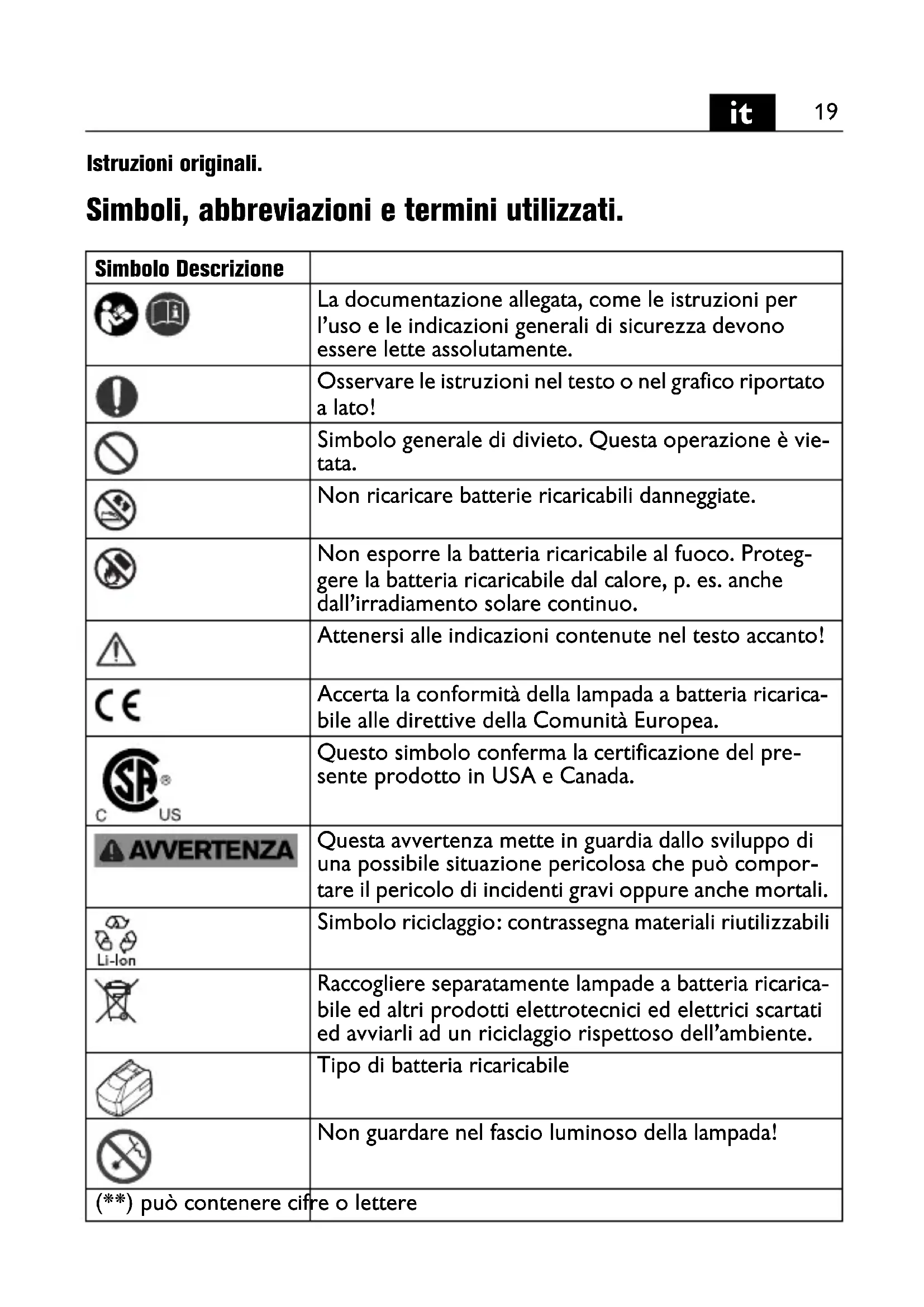 Istruzioni originali. Simboli, abbreviazioni e termini utilizzati. Simbolo Descrizione La documentazione allegata, come le istruzioni per l’uso e le indicazioni generali di sicurezza devono essere lette assolutamente. Osservare le istruzioni nel testo o nel grafico riportato a lato! Simbolo generale di divieto. Questa operazione è vie- tata. Non ricaricare batterie ricaricabili danneggiate. Non esporre la batteria ricaricabile al fuoco. Proteg- gere la batteria ricaricabile dal calore, p. es. anche dall’irradiamento solare continuo. Attenersi alle indicazioni contenute nel testo accanto! Accerta la conformità della lampada a batteria ricarica- bile alle direttive della Comunità Europea. Questo simbolo conferma la certificazione del pre- sente prodotto in USA e Canada. Questa avvertenza mette in guardia dallo sviluppo di una possibile situazione pericolosa che può compor- tare il pericolo di incidenti gravi oppure anche mortali. Simbolo riciclaggio: contrassegna materiali riutilizzabili Raccogliere separatamente lampade a batteria ricarica- bile ed altri prodotti elettrotecnici ed elettrici scartati ed avviarli ad un riciclaggio rispettoso dell’ambiente. Tipo di batteria ricaricabile Non guardare nel fascio luminoso della lampada! (**) può contenere cifre o lettere OBJ_BUCH-0000000215-001.book Page 19 Friday, August 7, 2015 9:31 AM20
