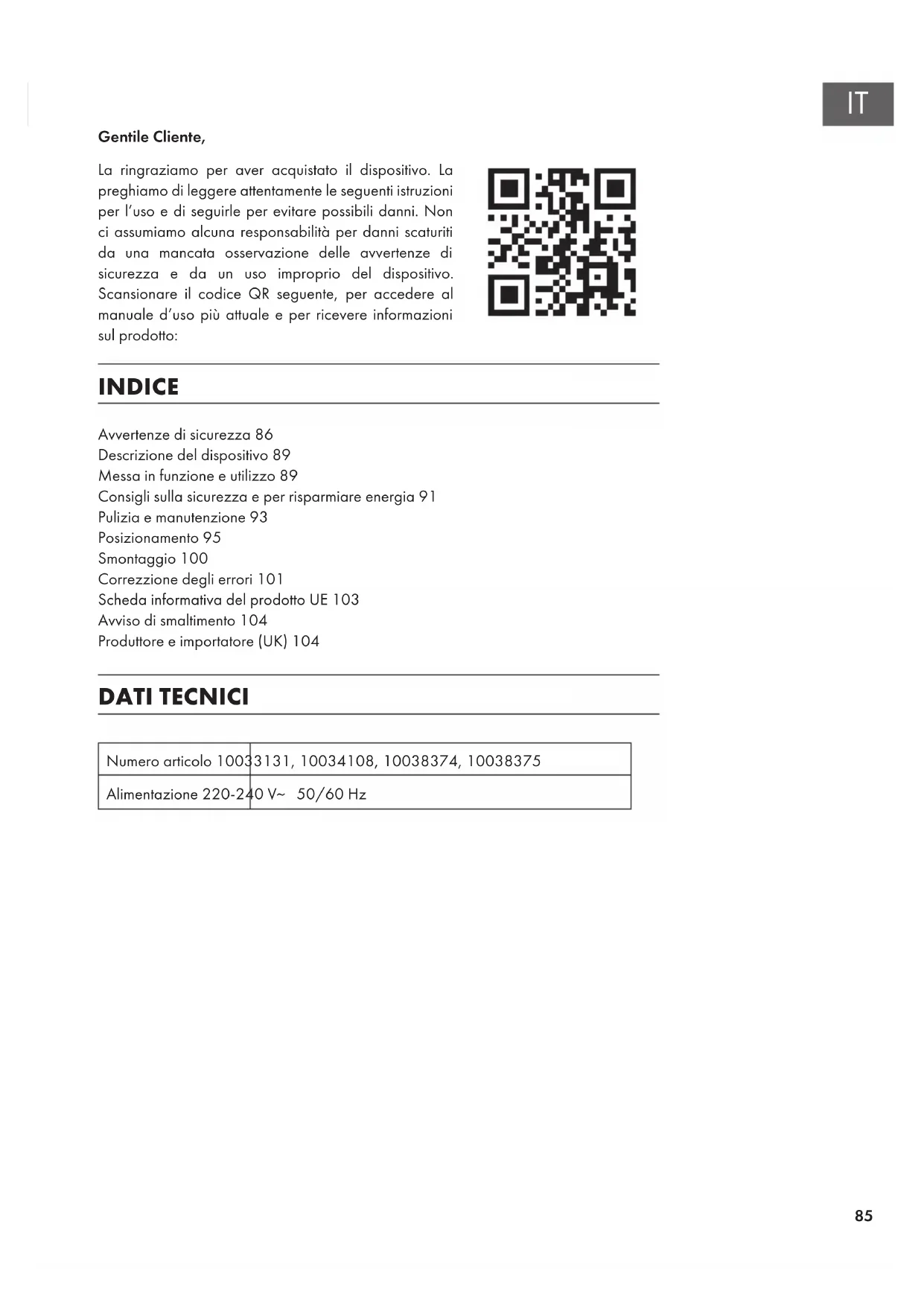 DATI TECNICI Numero articolo 10033131, 10034108, 10038374, 10038375 Alimentazione 220-240 V~ 50/60 Hz Gentile Cliente, La ringraziamo per aver acquistato il dispositivo. La preghiamo di leggere attentamente le seguenti istruzioni per l’uso e di seguirle per evitare possibili danni. Non ci assumiamo alcuna responsabilità per danni scaturiti da una mancata osservazione delle avvertenze di sicurezza e da un uso improprio del dispositivo. Scansionare il codice QR seguente, per accedere al manuale d’uso più attuale e per ricevere informazioni sul prodotto: INDICE Avvertenze di sicurezza 86 Descrizione del dispositivo 89 Messa in funzione e utilizzo 89 Consigli sulla sicurezza e per risparmiare energia 91 Pulizia e manutenzione 93 Posizionamento 95 Smontaggio 100 Correzzione degli errori 101 Scheda informativa del prodotto UE 103 Avviso di smaltimento 104 Produttore e importatore (UK) 10486
