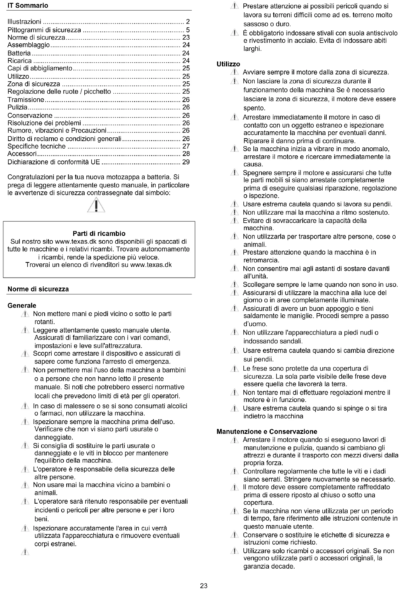 Norme di sicurezza Generale Non mettere mani e piedi vicino o sotto le parti rotanti. Leggere attentamente questo manuale utente. Assicurati di familiarizzare con i vari comandi, impostazioni e leve sull'attrezzatura. Scopri come arrestare il dispositivo e assicurati di sapere come funziona l'arresto di emergenza. Non permettere mai l'uso della macchina a bambini o a persone che non hanno letto il presente manuale. Si noti che potrebbero esserci normative locali che prevedono limiti di età per gli operatori. In caso di malessere o se si sono consumati alcolici o farmaci, non utilizzare la macchina. Ispezionare sempre la macchina prima dell'uso. Verificare che non vi siano parti usurate o danneggiate. Si consiglia di sostituire le parti usurate o danneggiate e le viti in blocco per mantenere l'equilibrio della macchina. L'operatore è responsabile della sicurezza delle altre persone. Non usare mai la macchina vicino a bambini o animali. L'operatore sarà ritenuto responsabile per eventuali incidenti o pericoli per altre persone e per i loro beni. Ispezionare accuratamente l'area in cui verrà utilizzata l'apparecchiatura e rimuovere eventuali corpi estranei. Prestare attenzione ai possibili pericoli quando si lavora su terreni difficili come ad es. terreno molto sassoso o duro. È obbligatorio indossare stivali con suola antiscivolo e rivestimento in acciaio. Evita di indossare abiti larghi. Utilizzo Avviare sempre il motore dalla zona di sicurezza. Non lasciare la zona di sicurezza durante il funzionamento della macchina Se è necessario lasciare la zona di sicurezza, il motore deve essere spento. Arrestare immediatamente il motore in caso di contatto con un oggetto estraneo e ispezionare accuratamente la macchina per eventuali danni. Riparare il danno prima di continuare. Se la macchina inizia a vibrare in modo anomalo, arrestare il motore e ricercare immediatamente la causa. Spegnere sempre il motore e assicurarsi che tutte le parti mobili si siano arrestate completamente prima di eseguire qualsiasi riparazione, regolazione o ispezione. Usare estrema cautela quando si lavora su pendii. Non utilizzare mai la macchina a ritmo sostenuto. Evitare di sovraccaricare la capacità della macchina. Non utilizzarla per trasportare altre persone, cose o animali. Prestare attenzione quando la macchina è in retromarcia. Non consentire mai agli astanti di sostare davanti all'unità. Scollegare sempre le lame quando non sono in uso. Assicurarsi di utilizzare la macchina alla luce del giorno o in aree completamente illuminate. Assicurati di avere un buon appoggio e tieni saldamente le maniglie. Procedi sempre a passo d’uomo. Non utilizzare l'apparecchiatura a piedi nudi o indossando sandali. Usare estrema cautela quando si cambia direzione sui pendii. Le frese sono protette da una copertura di sicurezza. La sola parte visibile delle frese deve essere quella che lavorerà la terra. Non tentare mai di effettuare regolazioni mentre il motore è in funzione. Usare estrema cautela quando si spinge o si tira indietro la macchina Manutenzione e Conservazione Arrestare il motore quando si eseguono lavori di manutenzione e pulizia, quando si cambiano gli attrezzi e durante il trasporto con mezzi diversi dalla propria forza. Controllare regolarmente che tutte le viti e i dadi siano serrati. Stringere nuovamente se necessario. Il motore deve essere completamente raffreddato prima di essere riposto al chiuso o sotto una copertura. Se la macchina non viene utilizzata per un periodo di tempo, fare riferimento alle istruzioni contenute in questo manuale utente. Conservare o sostituire le etichette di sicurezza e istruzioni come richiesto. Utilizzare solo ricambi o accessori originali. Se non vengono utilizzate parti o accessori originali, la garanzia decade.24