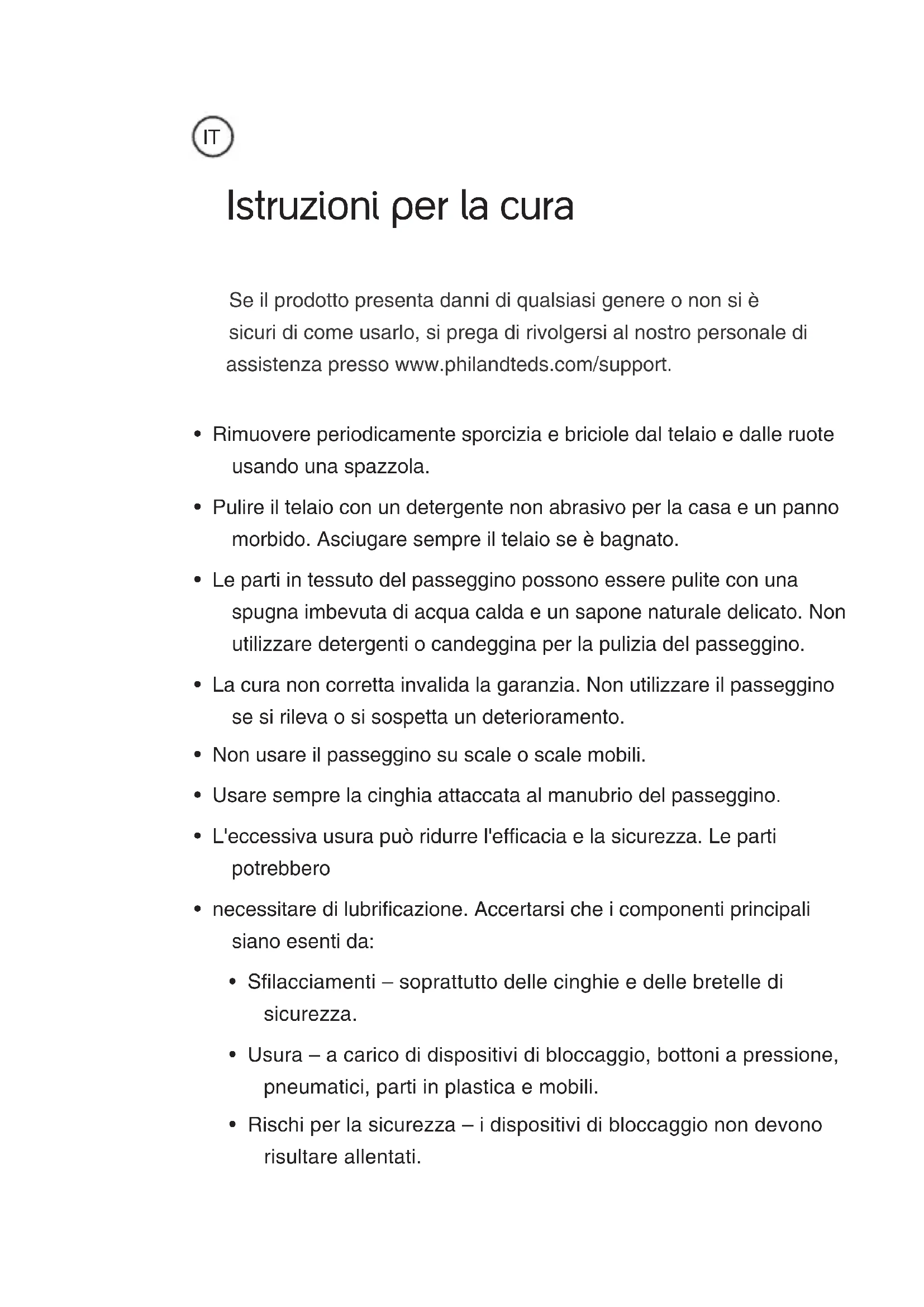 - Non lasciare mai il bambino incustodito. • Utilizzare soltanto accessori originali phil&teds con phil&teds questo prodotto è conforme ai requisiti vigenti nel Paese di vendita, vedere philandteds.com/certication49 passeggino. • Utilizzare soltanto ricambi originali phil&teds. L'uso di parti non originali può compromettere la sicurezza. • Carichi sospesi al manico o a qualsiasi altra parte del passeggino possono comprometterne la stabilità.