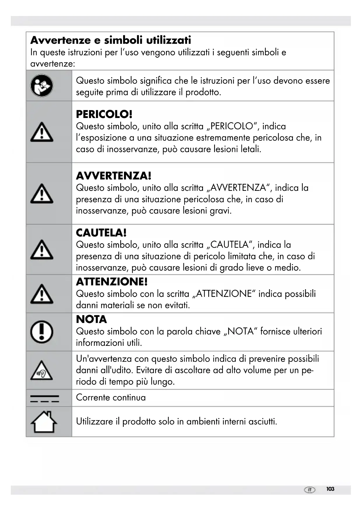 SOFFOCAMENTO! Il materiale di imballaggio non è un giocattolo. I bambini non possono giocare con il materiale di imballaggio. C‘è il rischio di soffocamento. Questo dispositivo non è destinato all‘uso da parte di individui (compresi i bambini) con capacità fisiche, sensoriali o mentali limitate o prive di esperienza e/o conoscenza, a meno che non siano supervisionati o abbiano ricevuto istruzioni da una persona responsabile della loro sicurezza su come per utilizzare il dispositivo.10 6 I bambini devono essere sorvegliati per assicurarsi che non stiano giocando con il dispositivo. La pulizia e la manutenzione da parte dell‘utente non devono essere eseguite da bambini a meno che non siano sotto la supervisione di un adulto. I bambini devono essere sorvegliati durante l‘utilizzo del dispositivo. PERICOLO! RISCHIO DI MORTE PER ELETTROCUZIONE! Tenere il prodotto lontano da umidità, gocce o schizzi d‘acqua! Non aprire mai il prodotto. Esiste il rischio di scossa elettrica se il prodotto viene aperto. Affidare tutte le riparazioni a personale qualificato. La manutenzione è necessaria quando il prodotto è stato danneggiato in qualsiasi modo. Questo è il caso, ad esempio, se il prodotto è danneggiato, è stato versato del liquido sul prodotto, sono caduti oggetti sul prodotto, il prodotto è stato esposto a pioggia o umidità, non funziona normalmente o è caduto. Tirare sempre la spina e non il cavo per scollegare la spina di alimentazione dalla presa. Non tirare il cavo audio. Non toccare mai la spina con le mani umide o bagnate, in quanto ciò potrebbe causare un cortocircuito o una scossa elettrica. Non posizionare mobili o oggetti simili sul cavo. Assicurarsi che il cavo non sia schiacciato. Non fare mai nodi con il cavo o legarlo insieme ad altri cavi. Un cavo o una spina danneggiati possono causare incendi o scosse elettriche. Controllare regolarmente il cavo e le spine. Non utilizzare un cavo o una spina danneggiati. La presa di rete utilizzata deve essere facilmente accessibile in modo che la spina di alimentazione possa essere scollegata rapidamente in caso di emergenza. Se si notano rumori insoliti, fumo o simili, è necessario estrarre immediatamente il cavo dalla presa di corrente e scollegare tutti i107 dispositivi collegati. Non riutilizzare il prodotto finché non è stato testato da una persona qualificata. Il prodotto può essere utilizzato solo in ambienti interni asciutti.