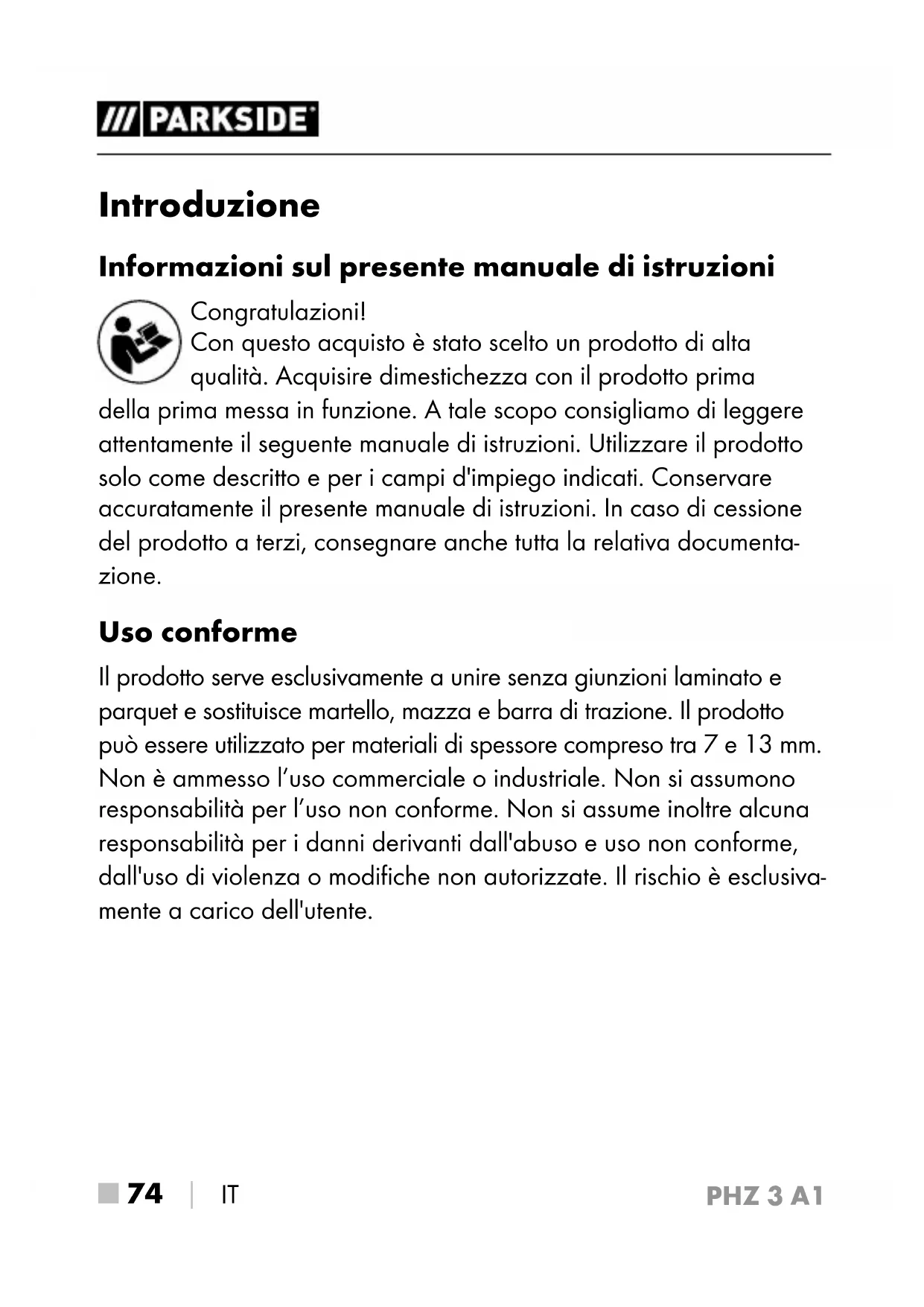IT Introduzione Informazioni sul presente manuale di istruzioni Congratulazioni! Con questo acquisto è stato scelto un prodotto di alta qualità. Acquisire dimestichezza con il prodotto prima della prima messa in funzione. A tale scopo consigliamo di leggere attentamente il seguente manuale di istruzioni. Utilizzare il prodotto solo come descritto e per i campi d'impiego indicati. Conservare accuratamente il presente manuale di istruzioni. In caso di cessione del prodotto a terzi, consegnare anche tutta la relativa documenta- zione. Uso conforme Il prodotto serve esclusivamente a unire senza giunzioni laminato e parquet e sostituisce martello, mazza e barra di trazione. Il prodotto può essere utilizzato per materiali di spessore compreso tra 7 e 13mm. Non è ammesso l’uso commerciale o industriale. Non si assumono responsabilità per l’uso non conforme. Non si assume inoltre alcuna responsabilità per i danni derivanti dall'abuso e uso non conforme, dall'uso di violenza o modifiche non autorizzate. Il rischio è esclusiva- mente a carico dell'utente. IB_380558_PHZ3A1_LB8.indb 74 01.04.2022 13:23:05PHZ 3 A1 IT