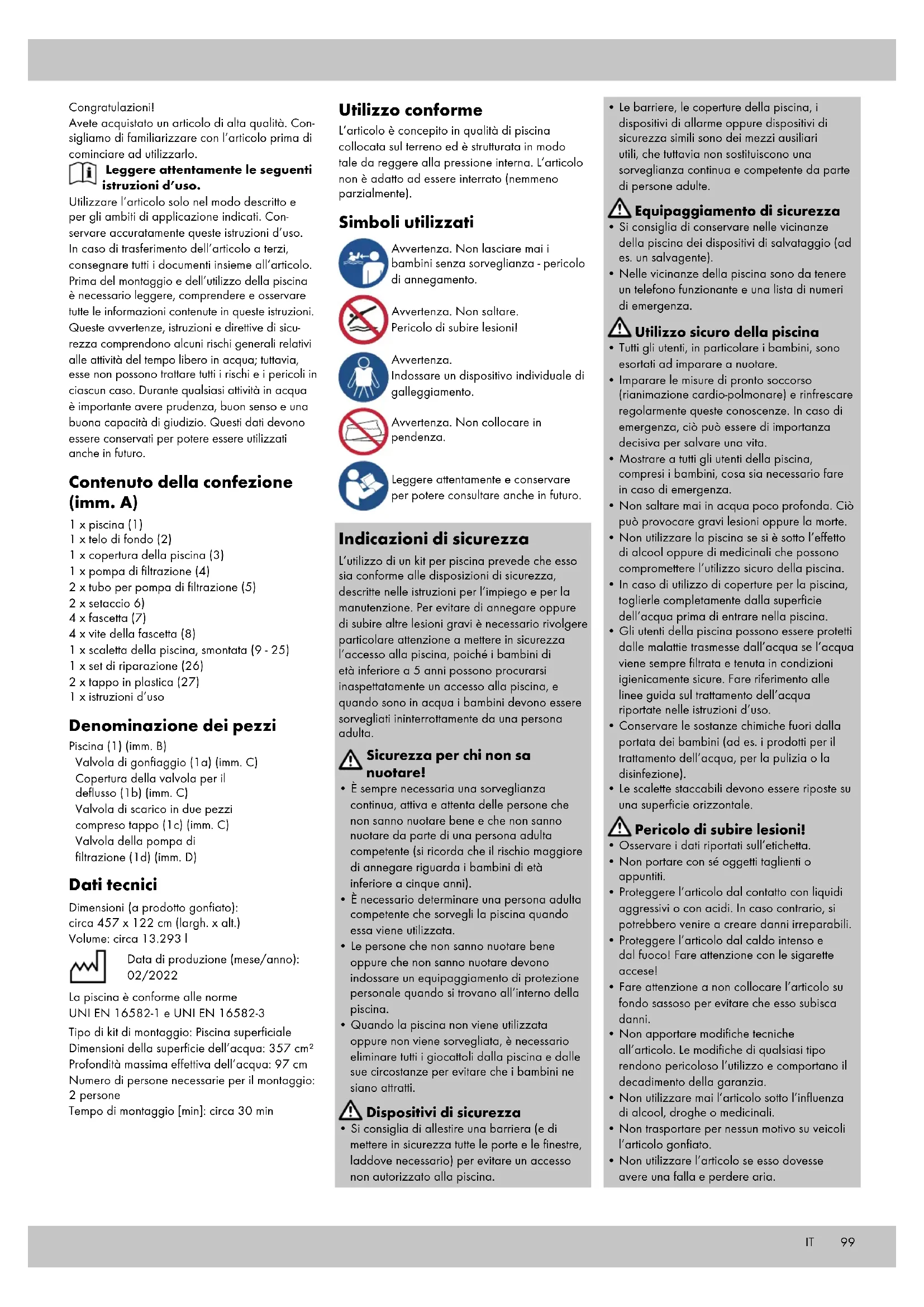 - Henvend dig til en fagspecialist. Henvisninger vedr. bortskaffelse Med henblik på at beskytte miljøet bedst muligt, er det vigtigt, at du ikke smider dit produkt ud sammen med husholdningsaf- faldet, når det ikke længere kan anvendes, men i stedet sørger for at bortskaffe det på en forsvarlig måde. For at få oplysninger om genbrugsstationer og deres åbningstider, bedes du kontakte deres ansvarlige administrati- on. Bortskaf produktet og emballagemateria- lerne miljørigtigt. Vær opmærksom på emballagemateria- lernes mærkning under affaldssorterin- gen. Disse er markeret med forkortelser (a) og tal (b), der har følgende betydning: 1-7: Kunststoffer/20-22: Papir og pap/ 80-98: Kompositmaterialer. Produktet og emballagematerialerne kan genbruges, hvorfor du bedes bortskaffe dem separat for at opnå en bedre affaldshåndtering. Triman-logoet er kun gældende for Frankrig. De forskellige bortskaffelsesmuligheder, der eksiste- rer for det udtjente produkt, kan du få mere infor- mation om hos kommune- eller byforvaltningen.99 Congratulazioni! Avete acquistato un articolo di alta qualità. Con- sigliamo di familiarizzare con l’articolo prima di cominciare ad utilizzarlo. Leggere attentamente le seguenti istruzioni d’uso. Utilizzare l’articolo solo nel modo descritto e per gli ambiti di applicazione indicati. Con- servare accuratamente queste istruzioni d’uso. In caso di trasferimento dell’articolo a terzi, consegnare tutti i documenti insieme all’articolo. Prima del montaggio e dell’utilizzo della piscina è necessario leggere, comprendere e osservare tutte le informazioni contenute in queste istruzioni. Queste avvertenze, istruzioni e direttive di sicu- rezza comprendono alcuni rischi generali relativi alle attività del tempo libero in acqua; tuttavia, esse non possono trattare tutti i rischi e i pericoli in ciascun caso. Durante qualsiasi attività in acqua è importante avere prudenza, buon senso e una buona capacità di giudizio. Questi dati devono essere conservati per potere essere utilizzati anche in futuro. Contenuto della confezione (imm. A) 1 x piscina (1) 1 x telo di fondo (2) 1 x copertura della piscina (3) 1 x pompa di filtrazione (4) 2 x tubo per pompa di filtrazione (5) 2 x setaccio 6) 4 x fascetta (7) 4 x vite della fascetta (8) 1 x scaletta della piscina, smontata (9 - 25) 1 x set di riparazione (26) 2 x tappo in plastica (27) 1 x istruzioni d’uso Denominazione dei pezzi Piscina (1) (imm. B) Valvola di gonfiaggio (1a) (imm. C) Copertura della valvola per il deflusso (1b) (imm. C) Valvola di scarico in due pezzi compreso tappo (1c) (imm. C) Valvola della pompa di filtrazione (1d) (imm. D) Dati tecnici Dimensioni (a prodotto gonfiato): circa 457 x 122 cm (largh. x alt.) Volume: circa 13.293 l Data di produzione (mese/anno): 02/2022 La piscina è conforme alle norme UNI EN 16582-1 e UNI EN 16582-3 Tipo di kit di montaggio: Piscina superficiale Dimensioni della superficie dell’acqua: 357 cm² Profondità massima effettiva dell’acqua: 97 cm Numero di persone necessarie per il montaggio: 2 persone Tempo di montaggio [min]: circa 30 min Utilizzo conforme L’articolo è concepito in qualità di piscina collocata sul terreno ed è strutturata in modo tale da reggere alla pressione interna. L’articolo non è adatto ad essere interrato (nemmeno parzialmente). Simboli utilizzati Avvertenza. Non lasciare mai i bambini senza sorveglianza - pericolo di annegamento. Avvertenza. Non saltare. Pericolo di subire lesioni! Avvertenza. Indossare un dispositivo individuale di galleggiamento. Avvertenza. Non collocare in pendenza. Leggere attentamente e conservare per potere consultare anche in futuro. Indicazioni di sicurezza L’utilizzo di un kit per piscina prevede che esso sia conforme alle disposizioni di sicurezza, descritte nelle istruzioni per l’impiego e per la manutenzione. Per evitare di annegare oppure di subire altre lesioni gravi è necessario rivolgere particolare attenzione a mettere in sicurezza l’accesso alla piscina, poiché i bambini di età inferiore a 5 anni possono procurarsi inaspettatamente un accesso alla piscina, e quando sono in acqua i bambini devono essere sorvegliati ininterrottamente da una persona adulta. Sicurezza per chi non sa nuotare!