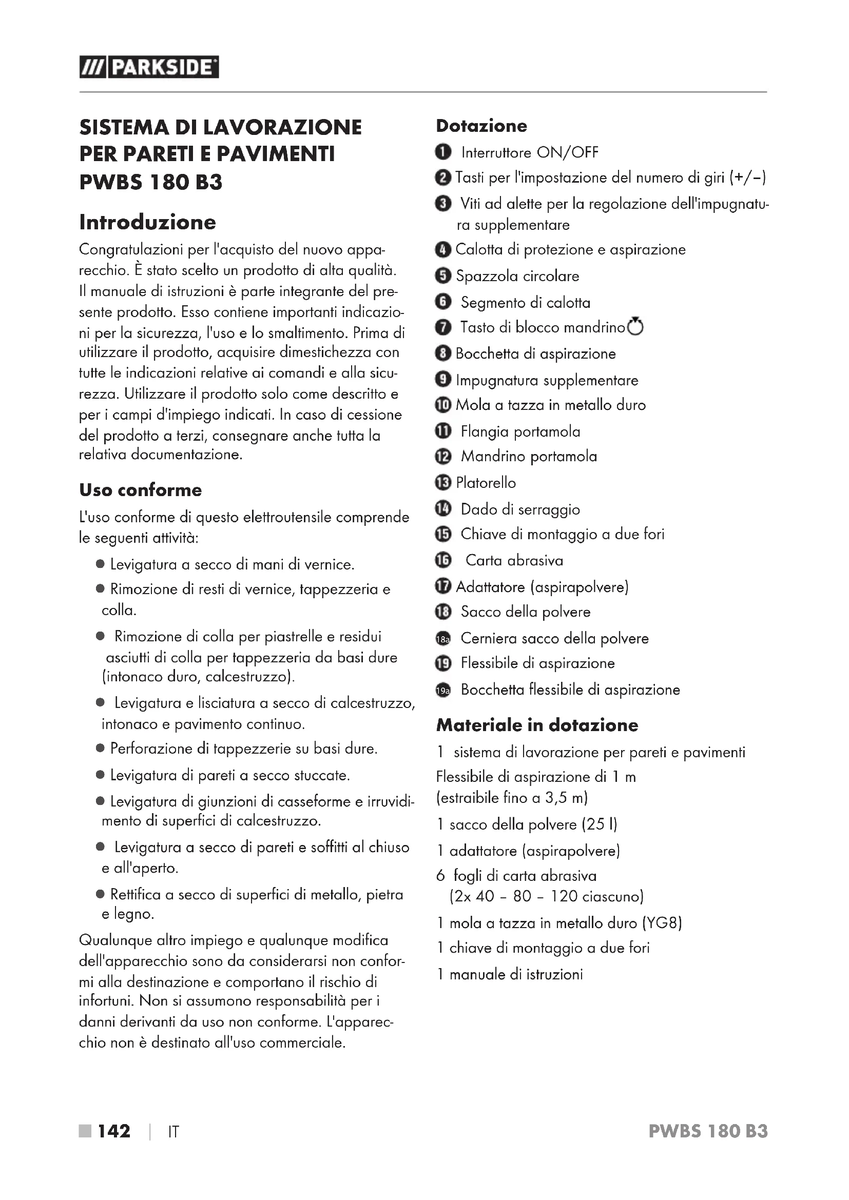 PWBS 180 B3 Introduzione Congratulazioni per l'acquisto del nuovo appa- recchio. È stato scelto un prodotto di alta qualità. Il manuale di istruzioni è parte integrante del pre- sente prodotto. Esso contiene importanti indicazio- ni per la sicurezza, l'uso e lo smaltimento. Prima di utilizzare il prodotto, acquisire dimestichezza con tutte le indicazioni relative ai comandi e alla sicu- rezza. Utilizzare il prodotto solo come descritto e per i campi d'impiego indicati. In caso di cessione del prodotto a terzi, consegnare anche tutta la relativa documentazione. Uso conforme L'uso conforme di questo elettroutensile comprende le seguenti attività: ▯ Levigatura a secco di mani di vernice. ▯ Rimozione di resti di vernice, tappezzeria e colla. ▯ Rimozione di colla per piastrelle e residui asciutti di colla per tappezzeria da basi dure (intonaco duro, calcestruzzo). ▯ Levigatura e lisciatura a secco di calcestruzzo, intonaco e pavimento continuo. ▯ Perforazione di tappezzerie su basi dure. ▯ Levigatura di pareti a secco stuccate. ▯ Levigatura di giunzioni di casseforme e irruvidi- mento di superfici di calcestruzzo. ▯ Levigatura a secco di pareti e soffitti al chiuso eall'aperto. ▯ Rettifica a secco di superfici di metallo, pietra elegno. Qualunque altro impiego e qualunque modifica dell'apparecchio sono da considerarsi non confor- mi alla destinazione e comportano il rischio di infortuni. Non si assumono responsabilità per i danni derivanti da uso non conforme. L'apparec- chio non è destinato all'uso commerciale. Dotazione Interruttore ON/OFF Tasti per l'impostazione del numero di giri (+/–) Viti ad alette per la regolazione dell'impugnatu- ra supplementare Calotta di protezione e aspirazione Spazzola circolare Segmento di calotta Tasto di blocco mandrino Bocchetta di aspirazione Impugnatura supplementare Mola a tazza in metallo duro Flangia portamola Mandrino portamola Platorello Dado di serraggio Chiave di montaggio a due fori Carta abrasiva Adattatore (aspirapolvere) Sacco della polvere 18a Cerniera sacco della polvere Flessibile di aspirazione 19a Bocchetta flessibile di aspirazione Materiale in dotazione 1 sistema di lavorazione per pareti e pavimenti Flessibile di aspirazione di 1 m (estraibile fino a 3,5 m) 1 sacco della polvere (25 l) 1 adattatore (aspirapolvere) 6 fogli di carta abrasiva (2x 40 – 80 – 120 ciascuno) 1 mola a tazza in metallo duro (YG8) 1 chiave di montaggio a due fori 1 manuale di istruzioniPWBS 180 B3 IT