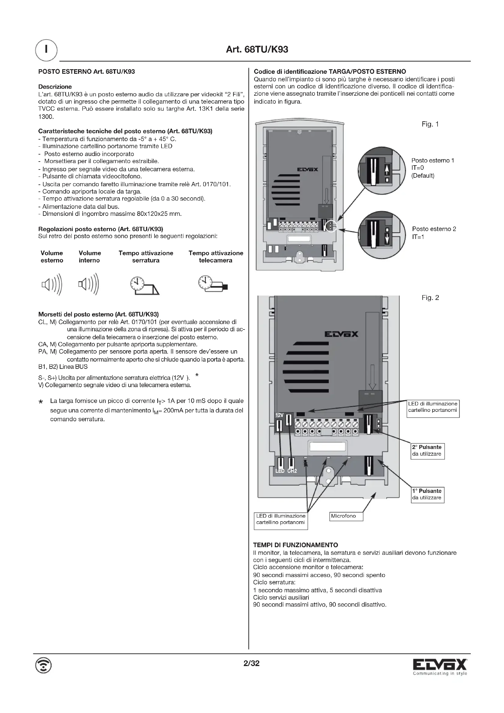 POSTO EXTERNO PARA KITS VÍDEO 2 FILI Il prodotto è conforme alla direttiva europea 2004/108/CE, 2006/95/CE e successive. Product is according to EC Directive 2004/108/CE, 2006/95/CE and following norms. Le produit est conforme à la directive européenne 2004/108/CE, 2006/95/CE et suivantes. Das Produkt entspricht den europäischen Richtlinien 2004/108/CE, 2006/95/CE und Nachfolgenden. El producto es conforme a la directiva europea 2004/108/CE, 2006/95/CE y sucesivas. O produto está conforme a directiva europeia 2004/108/CE, 2006/95/CE e seguintes. PDGB EFI MANUALE PER IL COLLEGAMENTO E L’USO - INSTALLATION AND OPERATION MANUAL - MANUEL POUR LA CONNEXION ET L’EMPLOI INSTALLATION UND BEDIENUNGSANLEITUNG - MANUAL PARA EL CONEXIONADO Y EL USO - MANUAL DE INSTALAÇÃO E UTILIZAÇÃOMorsetti del posto esterno (Art. 68TU/K93)CL, M) Collegamento per relè Art. 0170/101 (per eventuale accensione diuna illuminazione della zona di ripresa). Si attiva per il periodo di ac-censione della telecamera o inserzione del posto esterno.CA, M) Collegamento per pulsante apriporta supplementare.PA, M) Collegamento per sensore porta aperta. Il sensore dev’essere uncontatto normalmente aperto che si chiude quando la porta è aperta.B1, B2) Linea BUSS-, S+) Uscita per alimentazione serratura elettrica (12V ).V) Collegamento segnale video di una telecamera esterna. Posto esterno 1 IT=0 (Default)Posto esterno 2 IT=1 La targa fornisce un picco di corrente I > 1A per 10 mS dopo il qualesegue una corrente di mantenimento I = 200mA per tutta la durata delcomando serratura.Codice di identificazione TARGA/POSTO ESTERNOQuando nell’impianto ci sono più targhe è necessario identificare i postiesterni con un codice di identificazione diverso. Il codice di identifica-zione viene assegnato tramite l’inserzione dei ponticelli nei contatti comeindicato in figura. POSTO ESTERNO Art. 68TU/K93DescrizioneL’art. 68TU/K93 è un posto esterno audio da utilizzare per videokit “2 Fili”,dotato di un ingresso che permette il collegamento di una telecamera tipoTVCC esterna. Può essere installato solo su targhe Art. 13K1 della serie1300.Caratteristeche tecniche del posto esterno (Art. 68TU/K93)- Temperatura di funzionamento da -5° a + 45° C.- Illuminazione cartellino portanome tramite LED- Posto esterno audio incorporato- Morsettiera per il collegamento estraibile.- Ingresso per segnale video da una telecamera esterna.- Pulsante di chiamata videocitofono.- Uscita per comando faretto illuminazione tramite relè Art. 0170/101.- Comando apriporta locale da targa.- Tempo attivazione serratura regolabile (da 0 a 30 secondi).- Alimentazione data dal bus.- Dimensioni di ingombro massime 80x120x25 mm.Regolazioni posto esterno (Art. 68TU/K93)Sul retro del posto esterno sono presenti le seguenti regolazioni: Fig. 1 Microfono1° Pulsanteda utilizzareLED di illuminazionecartellino portanomi Fig. 2 2° Pulsanteda utilizzareLED di illuminazionecartellino portanomi LED CH2 12V Art. 68TU/K93 TEMPI DI FUNZIONAMENTO Il monitor, la telecamera, la serratura e servizi ausiliari devono funzionarecon i seguenti cicli di intermittenza.Ciclo accensione monitor e telecamera:90 secondi massimi acceso, 90 secondi spento Ciclo serratura:1 secondo massimo attiva, 5 secondi disattivaCiclo servizi ausiliari90 secondi massimi attivo, 90 secondi disattivo. 2/32