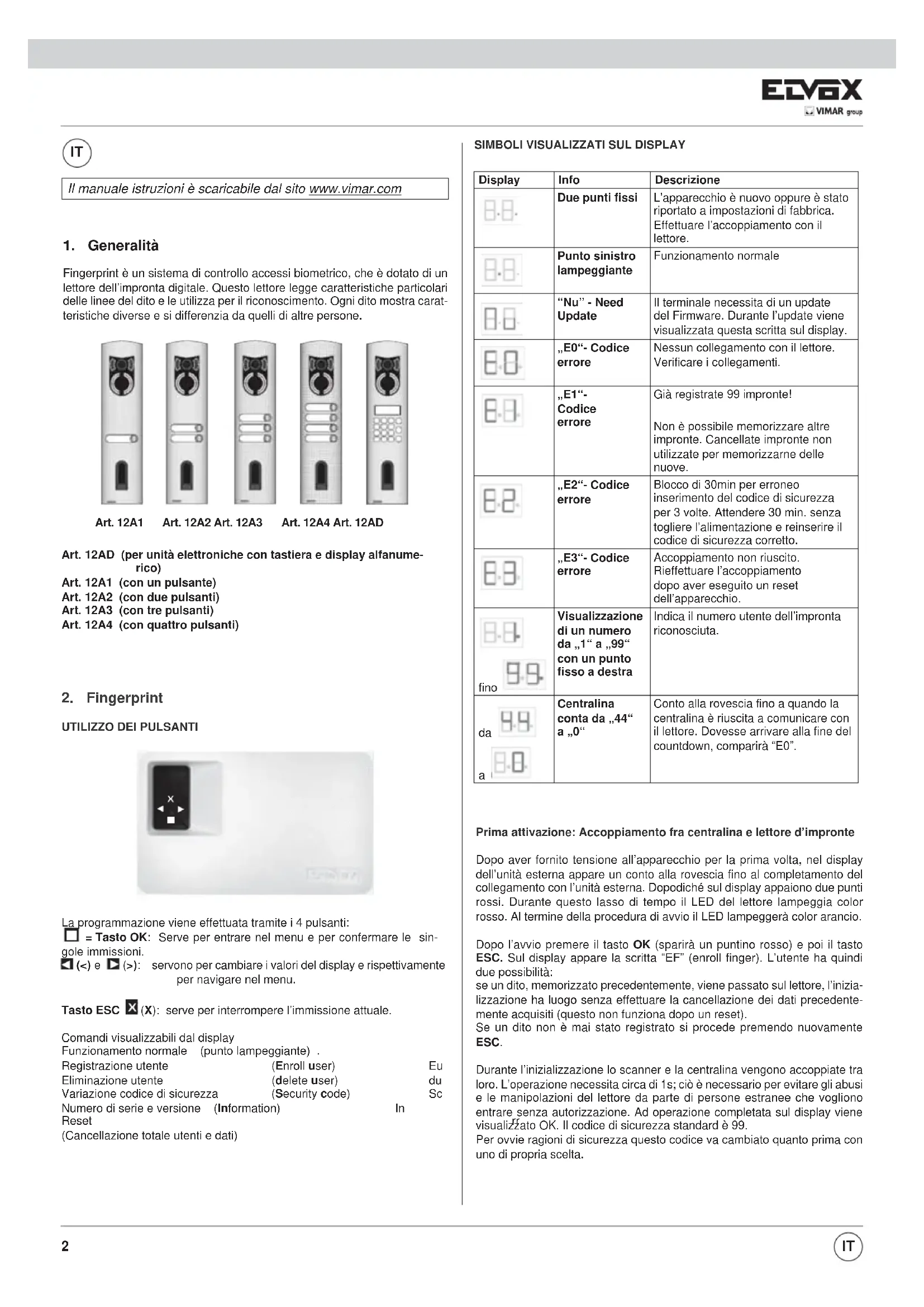 Fingerprint è un sistema di controllo accessi biometrico, che è dotato di un lettore dell’impronta digitale. Questo lettore legge caratteristiche particolari delle linee del dito e le utilizza per il riconoscimento. Ogni dito mostra carat- teristiche diverse e si differenzia da quelli di altre persone. Art. 12AD (per unità elettroniche con tastiera e display alfanume- rico) Art. 12A1 (con un pulsante) Art. 12A2 (con due pulsanti) Art. 12A3 (con tre pulsanti) Art. 12A4 (con quattro pulsanti) Art. 12A1 Art. 12A2 Art. 12A3 Art. 12A4 Art. 12AD