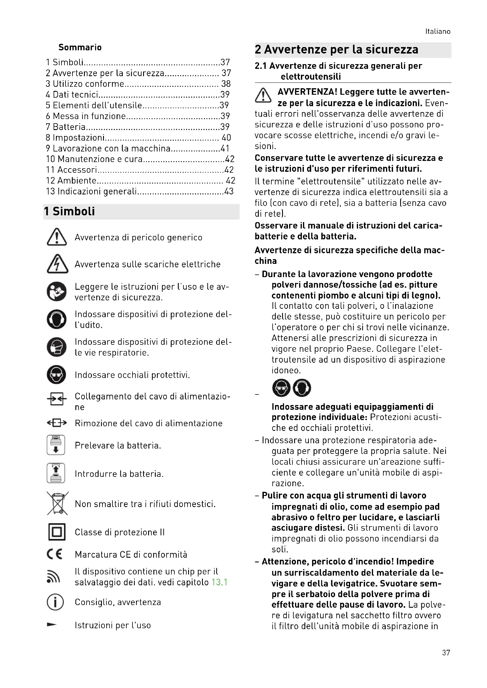 elettroutensili AVVERTENZA! Leggere tutte le avverten ze per la sicurezza e le indicazioni. Even tuali errori nell'osservanza delle avvertenze di sicurezza e delle istruzioni d'uso possono pro vocare scosse elettriche, incendi e/o gravi le sioni. Conservare tutte le avvertenze di sicurezza e le istruzioni d'uso per riferimenti futuri. Il termine "elettroutensile" utilizzato nelle av vertenze di sicurezza indica elettroutensili sia a filo (con cavo di rete), sia a batteria (senza cavo di rete). Osservare il manuale di istruzioni del carica batterie e della batteria. Avvertenze di sicurezza specifiche della mac china – Durante la lavorazione vengono prodotte polveri dannose/tossiche (ad es. pitture contenenti piombo e alcuni tipi di legno). Il contatto con tali polveri, o l’inalazione delle stesse, può costituire un pericolo per l’operatore o per chi si trovi nelle vicinanze. Attenersi alle prescrizioni di sicurezza in vigore nel proprio Paese. Collegare l'elet troutensile ad un dispositivo di aspirazione idoneo.