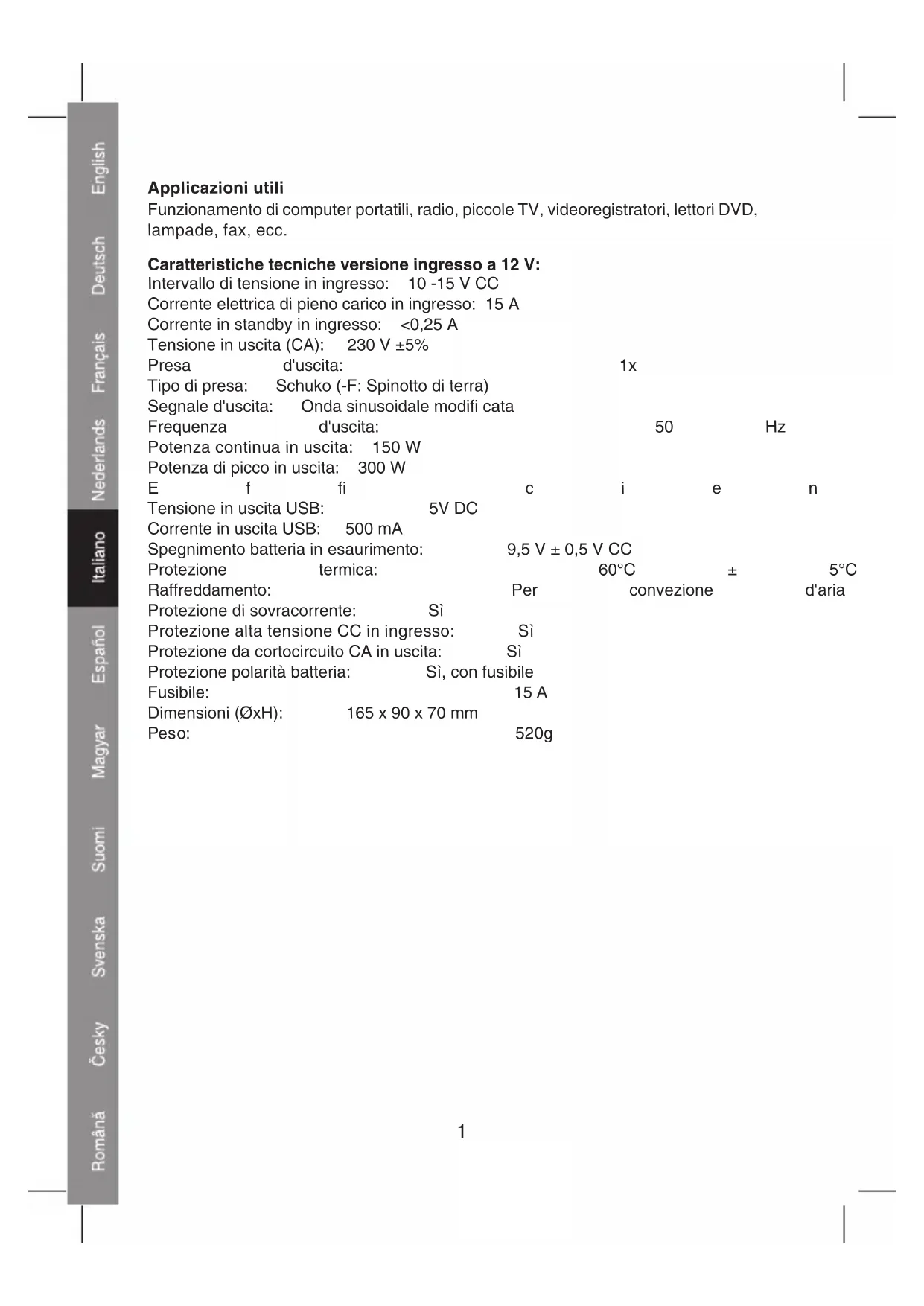 USCITA USBApplicazioni utili Funzionamento di computer portatili, radio, piccole TV, videoregistratori, lettori DVD, lampade, fax, ecc. Caratteristiche tecniche versione ingresso a 12 V: Intervallo di tensione in ingresso: 10 -15 V CC Corrente elettrica di pieno carico in ingresso: 15 A Corrente in standby in ingresso: <0,25 A Tensione in uscita (CA): 230 V ±5% Presa d'uscita: 1x Tipo di presa: Schuko (-F: Spinotto di terra) Segnale d'uscita: Onda sinusoidale modifi cata Frequenza d'uscita: 50 Hz Potenza continua in uscita: 150 W Potenza di picco in uscita: 300 W Effi cienza: >90% Tensione in uscita USB: 5V DC Corrente in uscita USB: 500 mA Spegnimento batteria in esaurimento: 9,5 V ± 0,5 V CC Protezione termica: 60°C ± 5°C Raffreddamento: Per convezione d'aria Protezione di sovracorrente: Sì Protezione alta tensione CC in ingresso: Sì Protezione da cortocircuito CA in uscita: Sì Protezione polarità batteria: Sì, con fusibile Fusibile: 15 A Dimensioni (ØxH): 165 x 90 x 70 mm Peso: 520g 1Caratteristiche tecniche versione ingresso a 24 V: Intervallo di tensione in ingresso: 20-30 V CC Corrente elettrica di pieno carico in ingresso: 10A Corrente in standby in ingresso: <0,2 A Tensione in uscita (CA): 230 V ±5% Presa d'uscita: 1x Tipo di presa: Schuko (-F: Spinotto di terra) Segnale d'uscita: Onda sinusoidale pura Frequenza d'uscita: 50 Hz Potenza continua in uscita: 150 W Potenza di picco in uscita: 300 W Effi cienza: >90% Tensione in uscita USB: 5 V DC Corrente in uscita USB: 500 mA Spegnimento batteria in esaurimento: 19,5 V ± 0,8 V CC Protezione termica: 60°C ± 5°C Raffreddamento: Per convezione d'aria Protezione di sovracorrente: Sì Protezione alta tensione CC in ingresso: Sì Protezione da cortocircuito CA in uscita: Sì Protezione polarità batteria: Sì, con fusibile Fusibile: 10A Dimensioni (ØxH): 165 x 90 x 70 mm Peso: 520g 2Istruzioni operative: