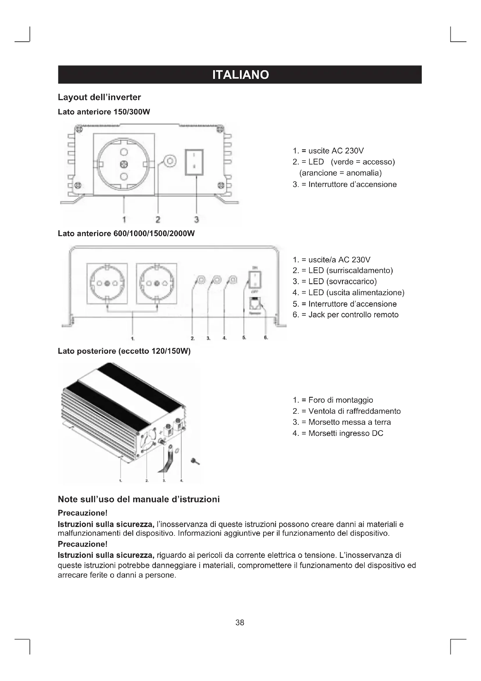 (arancione = anomalia) 3.=Interruttored’accensione Lato anteriore 600/1000/1500/2000W 1.=uscite/aAC230V