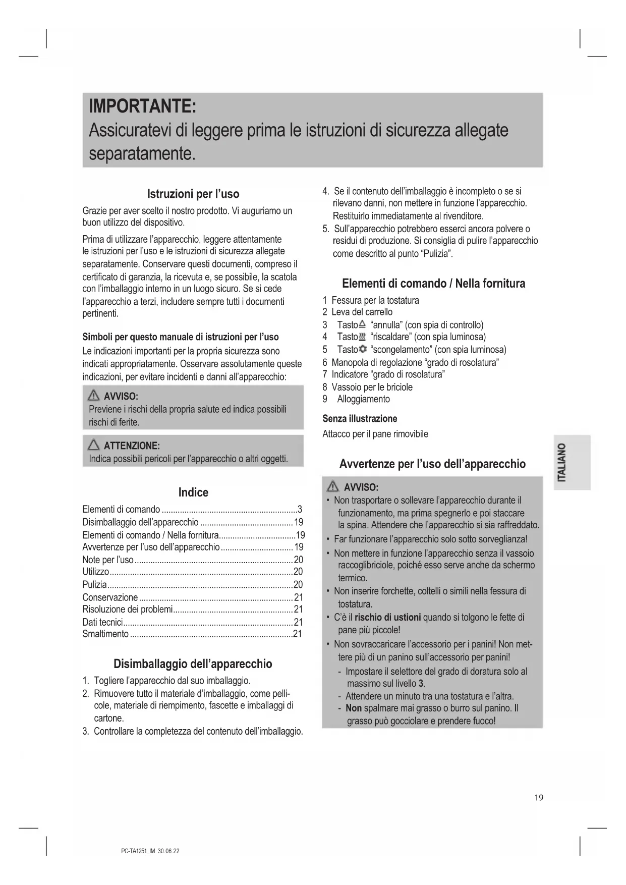 - Non sovraccaricare l’accessorio per i panini! Non met- tere più di un panino sull’accessorio per panini! - Impostare il selettore del grado di doratura solo al massimo sul livello 3. - Attendere un minuto tra una tostatura e l’altra. - Non spalmare mai grasso o burro sul panino. Il grasso può gocciolare e prendere fuoco!PC-TA1251_IM 30.06.22