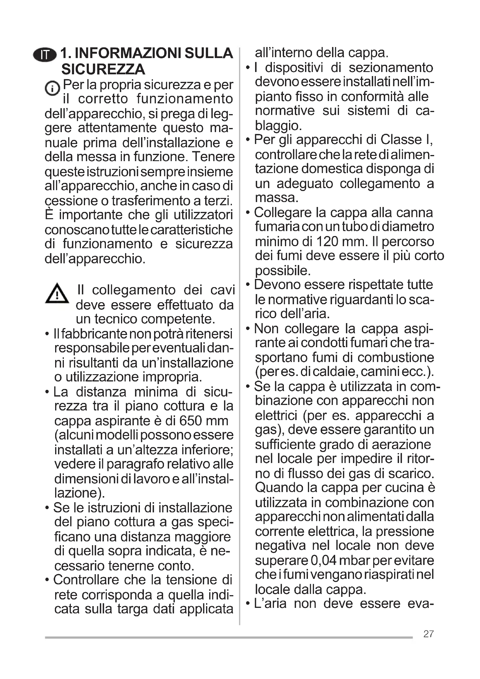 - Devono essere rispettate tutte le normative riguardanti lo sca- rico dell’aria.