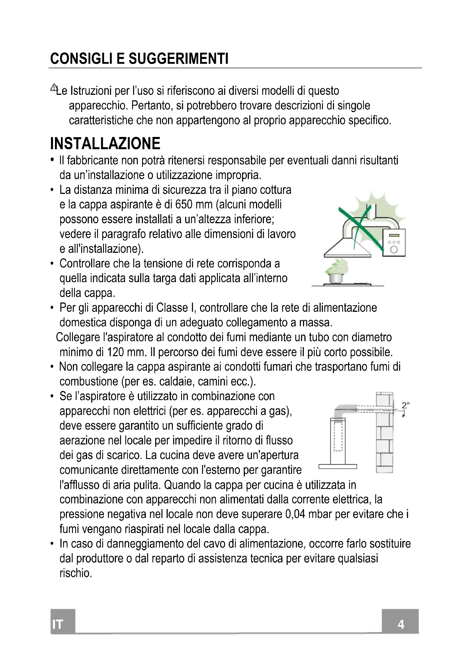 - Se l’aspiratore è utilizzato in combinazione con apparecchi non elettrici (per es. apparecchi a gas), deve essere garantito un sufficiente grado di aerazione nel locale per impedire il ritorno di flusso dei gas di scarico. La cucina deve avere un'apertura comunicante direttamente con l'esterno per garantire l'afflusso di aria pulita. Quando la cappa per cucina è utilizzata in combinazione con apparecchi non alimentati dalla corrente elettrica, la pressione negativa nel locale non deve superare 0,04 mbar per evitare che i fumi vengano riaspirati nel locale dalla cappa.