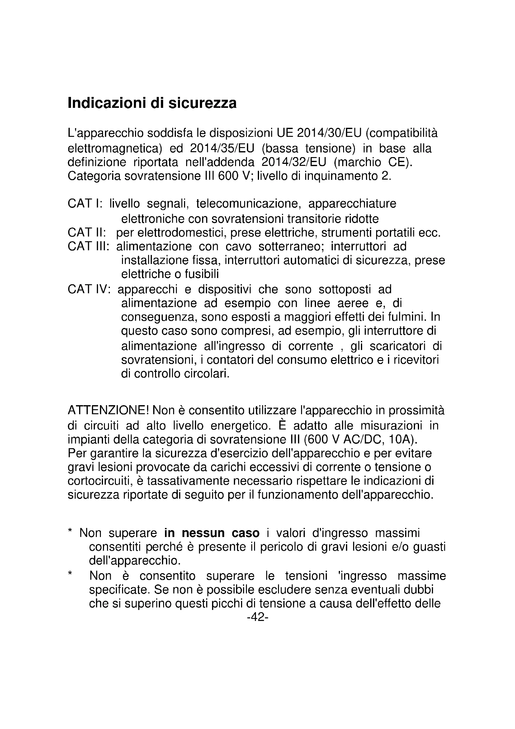 Les piles, qui contiennent des substances polluantes, portent le symbole d’une poubelle barrée similaire au symbole ci-contre. Sous ce symbole est indiquée la désignation chimique de la substance polluante. Par ex. « CD » pour le cadmium, « Pb » pour le plomb et « Hg » pour le mercure.Indicazioni di sicurezza L'apparecchio soddisfa le disposizioni UE 2014/30/EU (compatibilità elettromagnetica) ed 2014/35/EU (bassa tensione) in base alla definizione riportata nell'addenda 2014/32/EU (marchio CE). Categoria sovratensione III 600 V; livello di inquinamento 2. CAT I: livello segnali, telecomunicazione, apparecchiature elettroniche con sovratensioni transitorie ridotte CAT II: per elettrodomestici, prese elettriche, strumenti portatili ecc. CAT III: alimentazione con cavo sotterraneo; interruttori ad installazione fissa, interruttori automatici di sicurezza, prese elettriche o fusibili CAT IV: apparecchi e dispositivi che sono sottoposti ad alimentazione ad esempio con linee aeree e, di conseguenza, sono esposti a maggiori effetti dei fulmini. In questo caso sono compresi, ad esempio, gli interruttore di alimentazione all'ingresso di corrente , gli scaricatori di sovratensioni, i contatori del consumo elettrico e i ricevitori di controllo circolari. ATTENZIONE! Non è consentito utilizzare l'apparecchio in prossimità di circuiti ad alto livello energetico. È adatto alle misurazioni in impianti della categoria di sovratensione III (600 V AC/DC, 10A). Per garantire la sicurezza d'esercizio dell'apparecchio e per evitare gravi lesioni provocate da carichi eccessivi di corrente o tensione o cortocircuiti, è tassativamente necessario rispettare le indicazioni di sicurezza riportate di seguito per il funzionamento dell'apparecchio.