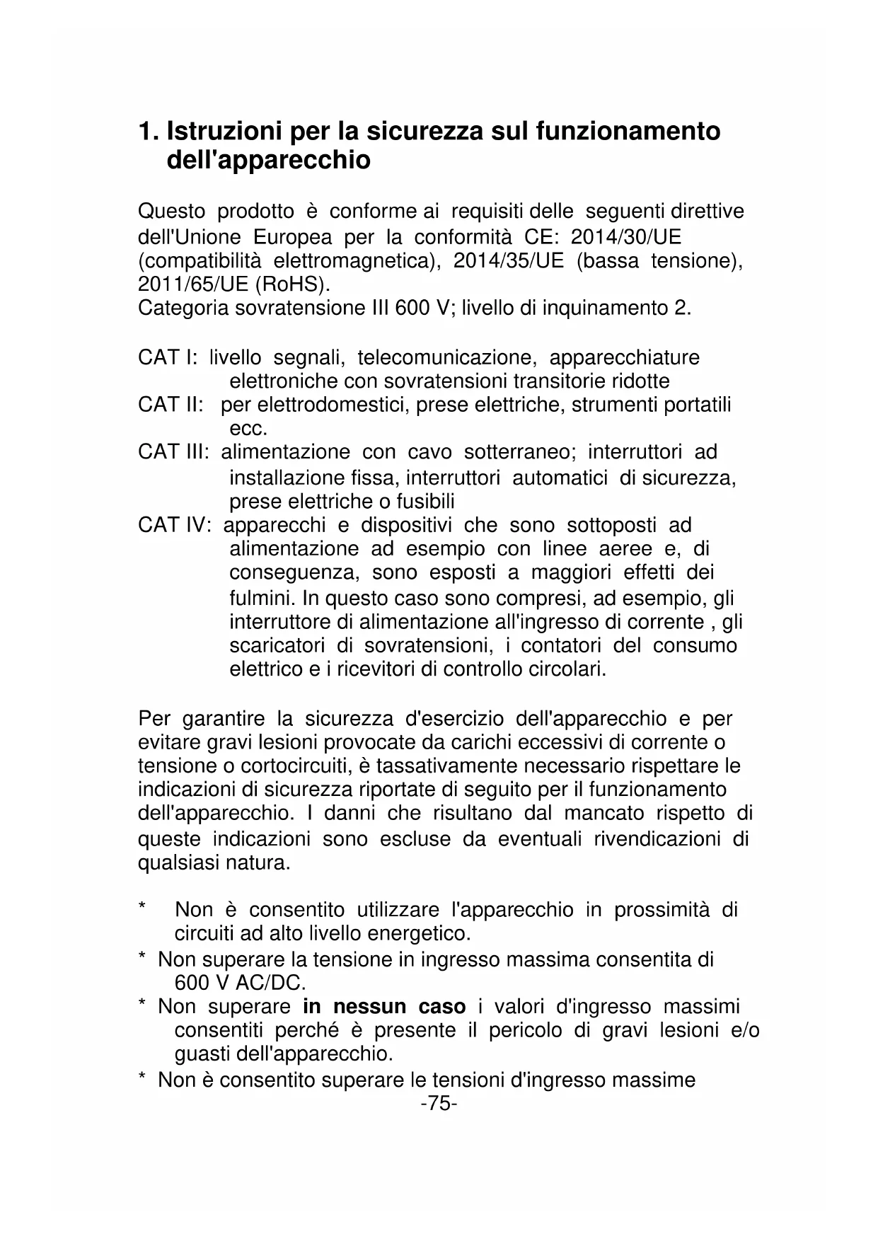 -74-1. Istruzioni per la sicurezza sul funzionamento dell'apparecchio Questo prodotto è conforme ai requisiti delle seguenti direttive dell'Unione Europea per la conformità CE: 2014/30/UE (compatibilità elettromagnetica), 2014/35/UE (bassa tensione), 2011/65/UE (RoHS). Categoria sovratensione III 600 V; livello di inquinamento 2. CAT I: livello segnali, telecomunicazione, apparecchiature elettroniche con sovratensioni transitorie ridotte CAT II: per elettrodomestici, prese elettriche, strumenti portatili ecc. CAT III: alimentazione con cavo sotterraneo; interruttori ad installazione fissa, interruttori automatici di sicurezza, prese elettriche o fusibili CAT IV: apparecchi e dispositivi che sono sottoposti ad alimentazione ad esempio con linee aeree e, di conseguenza, sono esposti a maggiori effetti dei fulmini. In questo caso sono compresi, ad esempio, gli interruttore di alimentazione all'ingresso di corrente , gli scaricatori di sovratensioni, i contatori del consumo elettrico e i ricevitori di controllo circolari. Per garantire la sicurezza d'esercizio dell'apparecchio e per evitare gravi lesioni provocate da carichi eccessivi di corrente o tensione o cortocircuiti, è tassativamente necessario rispettare le indicazioni di sicurezza riportate di seguito per il funzionamento dell'apparecchio. I danni che risultano dal mancato rispetto di queste indicazioni sono escluse da eventuali rivendicazioni di qualsiasi natura.