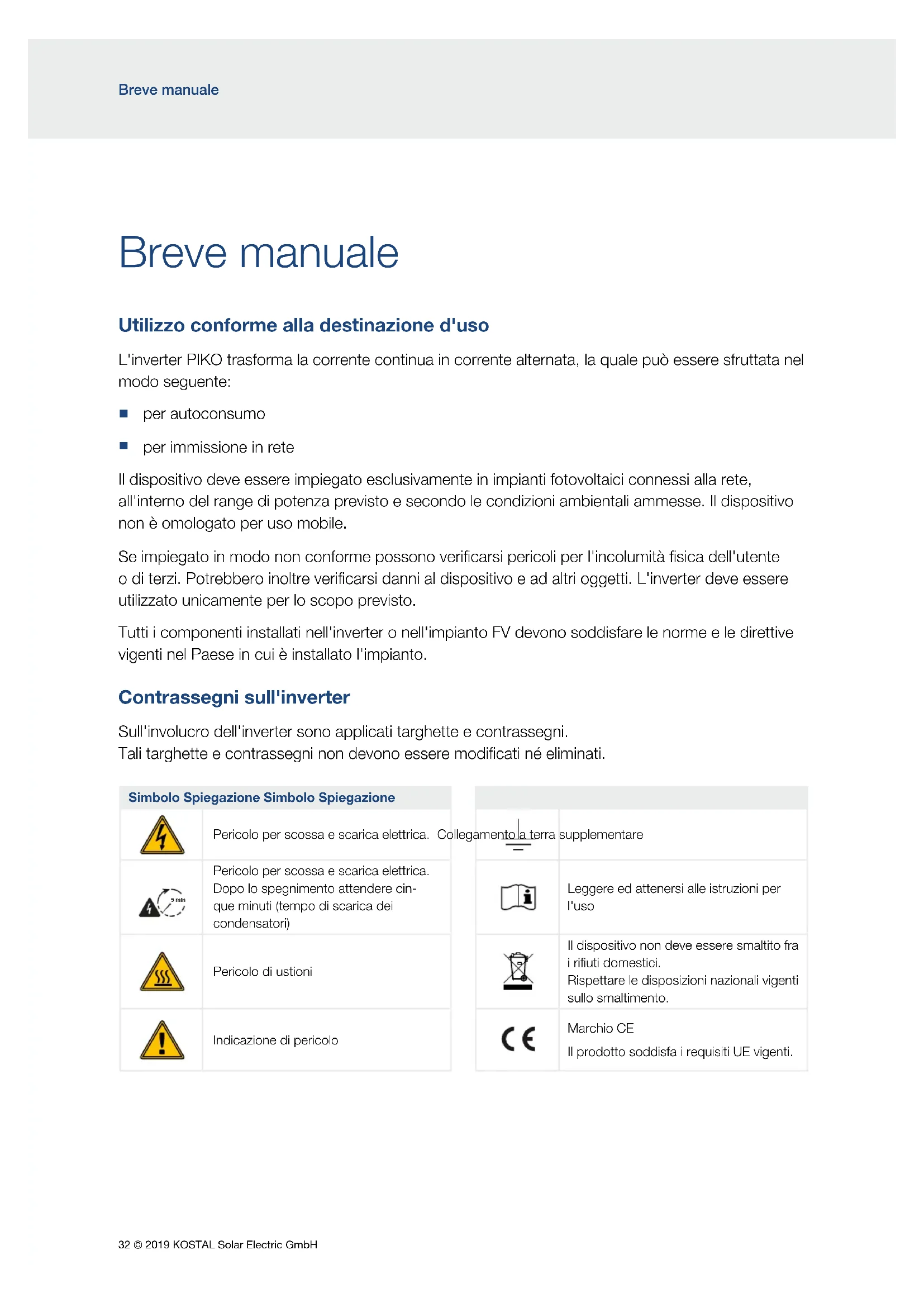 per immissione in rete Il dispositivo deve essere impiegato esclusivamente in impianti fotovoltaici connessi alla rete, all'interno del range di potenza previsto e secondo le condizioni ambientali ammesse. Il dispositivo non è omologato per uso mobile. Se impiegato in modo non conforme possono verificarsi pericoli per l'incolumità fisica dell'utente o di terzi. Potrebbero inoltre verificarsi danni al dispositivo e ad altri oggetti. L'inverter deve essere utilizzato unicamente per lo scopo previsto. Tutti i componenti installati nell'inverter o nell'impianto FV devono soddisfare le norme e le direttive vigenti nel Paese in cui è installato l'impianto. Contrassegni sull'inverter Sull'involucro dell'inverter sono applicati targhette e contrassegni. Tali targhette e contrassegni non devono essere modificati né eliminati. Simbolo Spiegazione Simbolo Spiegazione Pericolo per scossa e scarica elettrica. Collegamento a terra supplementare 5 min Pericolo per scossa e scarica elettrica. Dopo lo spegnimento attendere cin- que minuti (tempo di scarica dei condensatori) Leggere ed attenersi alle istruzioni per l'uso 5 min Pericolo di ustioni Il dispositivo non deve essere smaltito fra i rifiuti domestici. Rispettare le disposizioni nazionali vigenti sullo smaltimento. Indicazione di pericolo Marchio CE Il prodotto soddisfa i requisiti UE vigenti.© 2019 KOSTAL Solar Electric GmbH 33