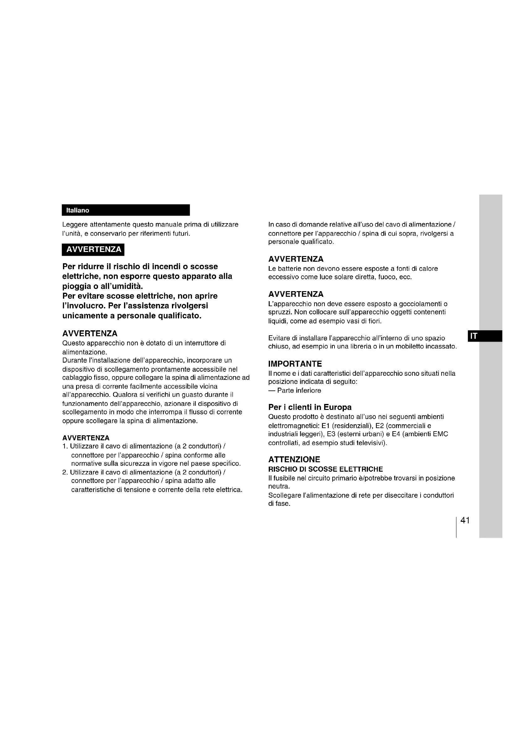 connettore per l’apparecchio / spina adatto alle caratteristiche di tensione e corrente della rete elettrica. In caso di domande relative all’uso del cavo di alimentazione / connettore per l’apparecchio / spina di cui sopra, rivolgersi a personale qualificato. AVVERTENZA Le batterie non devono essere esposte a fonti di calore eccessivo come luce solare diretta, fuoco, ecc. AVVERTENZA L’apparecchio non deve essere esposto a gocciolamenti o spruzzi. Non collocare sull’apparecchio oggetti contenenti liquidi, come ad esempio vasi di fiori. Evitare di installare l’apparecchio all’interno di uno spazio chiuso, ad esempio in una libreria o in un mobiletto incassato. IMPORTANTE Il nome e i dati caratteristici dell’apparecchio sono situati nella posizione indicata di seguito: — Parte inferiore Per i clienti in Europa Questo prodotto è destinato all’uso nei seguenti ambienti elettromagnetici: E1 (residenziali), E2 (commerciali e industriali leggeri), E3 (esterni urbani) e E4 (ambienti EMC controllati, ad esempio studi televisivi). ATTENZIONE