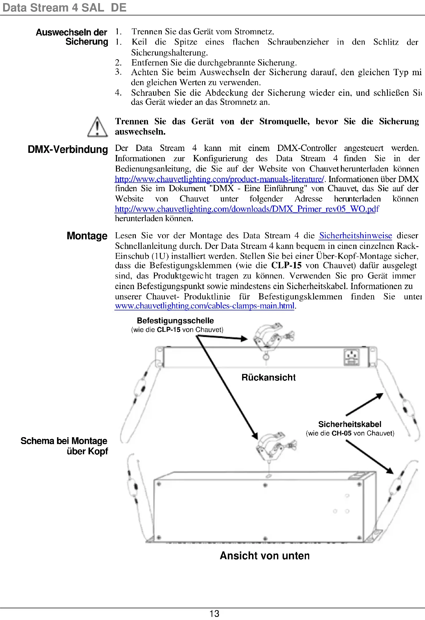 http://www.chauvetlighting.com/downloads/DMX_Primer_rev05_WO.pdf. Montaggio Prima di montare l'unità Data Stream 4, leggere le Note di Sicurezza. Data Stream