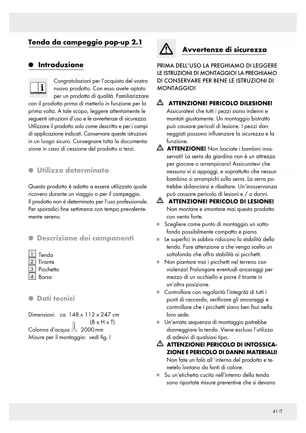 MENTO! In caso di ventilazione carente all‘interno della tenda sussisterebbe un pericolo di soffocamento. Precauzioni antincendio Campeggiare in sicurezza. Rispettare le seguenti regole di buon senso: Non posizionare apparecchi caldi vicino a pareti, soffitto o tendine. Osservare sempre le istruzioni di sicurezza dei suddetti apparecchi. Non consentire in qualsivoglia caso ai bambini di giocare nelle vicinanze di apparecchi caldi. Non ostruire l’uscita. Non bloccare l’uscita con degli oggetti. Assicurarsi di essere a conoscenza delle precau- zioni antincendio del sito. Fare attenzione alle condizioni di tempo atmosferico e alle loro conseguenze Nella scelta dell’area di montaggio tenere sempre conto delle caratteristiche del luogo e sulle sue eventuali possibilità di mutamento delle caratteristiche medesime. Ad esempio, l’area di montaggio ha caratteristiche tali che in caso di pioggia essa si allaga? Tenere conto dell’eventuale presenza di fiumi o di maree in crescita. Proteggere l’articolo da forte vento e da tem- pesta. Porre l’articolo, se possibile, in un luogo protetto dal vento. Prima dell’insorgere di forte vento sostituire i pic- chetti normali con picchetti speciali resistenti alla tempesta. Informarsi in un negozio specializzato dell’eventuale disponibilità di accessori utili. Smontare la tenda prima di una forte nevicata o di tempesta. Rimuovere subito la neve dal prodotto. In caso contrario il prodotto potrebbe crollare sotto il peso della neve. Non installare la tenda in modo troppo teso in caso contrario essa non si potrá adattare alle mutevoli condizioni di tempo e subirà dei danni. Le cerniere sono parti soggette ad usura e non rientrano nell’applicazione della garanzia. Il poliestere della tenda è realizzato da mate- riale idrorepellente. E’ possibile che la tenda all’inizio della precipi- tazione piovosa non sia completamente imper- meabile. L’umido fa tuttavia in modo che i fili della tenda si contraggano e in questo modo la tenda in breve tempo diventerà impermeabile. In caso di umidità e di pioggia i tessuti della tenda si dilatano in modo diverso e rendono necessario un nuovo tensionamento dei tiranti. Quando il materiale, durante l’asciugamento, diventa nuovamente teso, i tiranti devono essere di nuovo allentati per tempo. Non utilizzare alcun spray anti-insetti nella tenda o su di essa. Eventuali piccoli punti non a tenuta alle cuciture possono esser riparati con uno spray per cuciture e per il telo della tenda può essere utilizzato uno spray impregnante. Montaggio Si prega di assicurarsi che il prodotto venga mon- tato / smontato solo da una persona competente. Montaggio della tenda ATTENZIONE: Passicurarsi che il tirante sia sempre teso e che rispetti la forma naturale della tenda. Assicurarsi che la forza di tensione non provochi danni.43 IT Rimuovere l‘elastico in gomma e gettare la tenda in aria in direzione frontale. Montare la tenda con i tiranti