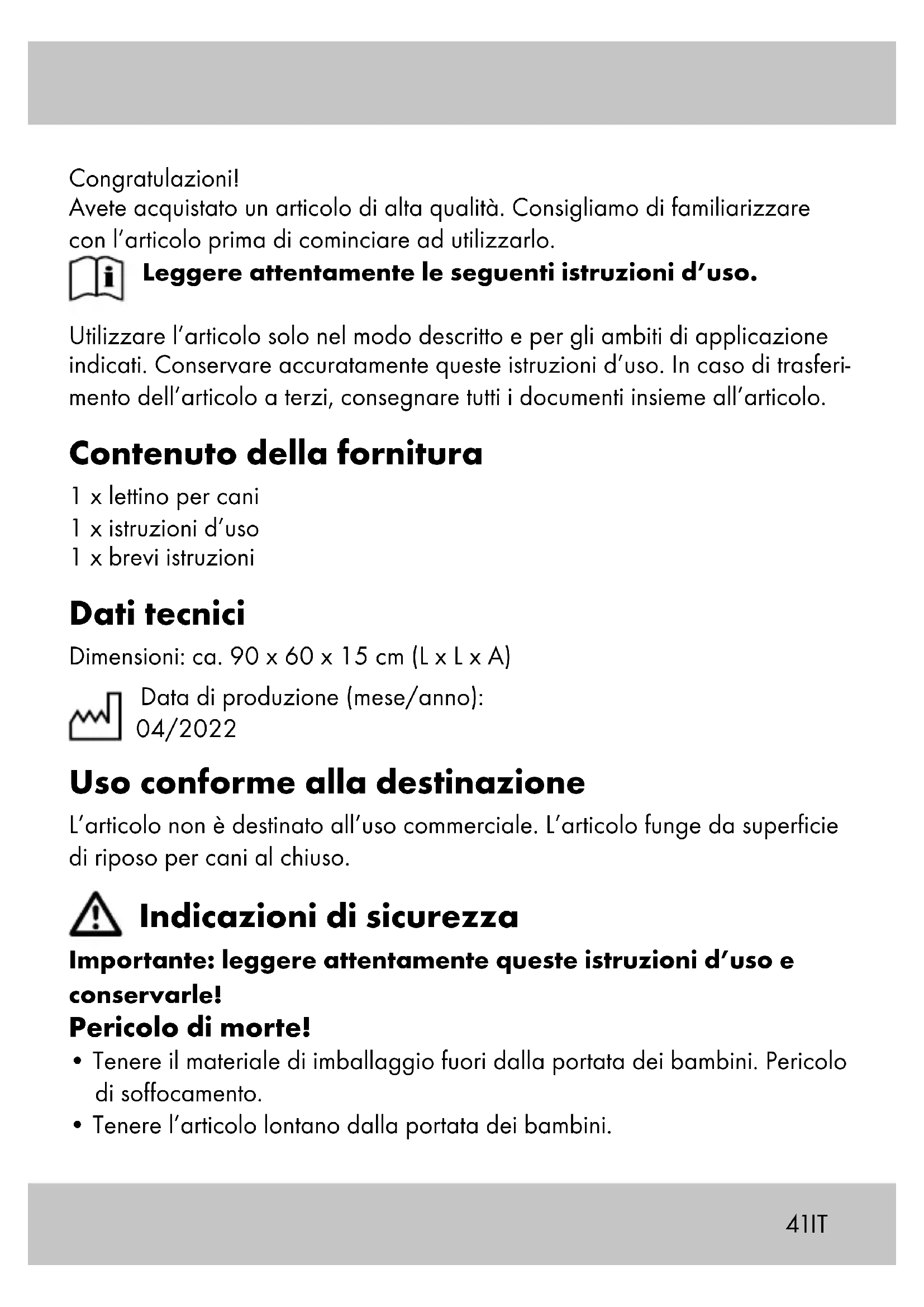 - Utilizzare l’articolo solo per lo scopo previsto. Uso (fig. A) L’articolo dispone di una superficie rinfrescante e una riscaldante. Superficie rinfrescante: motivo piccolo Superficie riscaldante: motivo grande Nota: la superficie riscaldante presenta una lamina che emette un rumore di crepitio. Questa speciale lamina riflette il calore corporeo del cane. Il lato rinfrescante assorbe il calore corporeo del cane. Pulizia e manutenzione In caso di mancato utilizzo, riporre l’articolo a temperatura ambiente in un luogo asciutto e pulito. Scuotere regolarmente l’articolo e pulirlo con l’aspi- rapolvere. Non utilizzare detergenti aggressivi per la pulizia. Lo sporco più consistente può essere rimosso con un panno umido. Per una migliore pulizia dell’articolo, è possibile aprire la cerniera e rimuovere il cuscino interno. Dopo la pulizia lasciare asciugare completamente e inserire di nuovo il cuscino interno. Fodera: IT43IT Smaltimento Smaltire l’articolo e i materiali dell’imballaggio in conformità con le direttive locali in vigore. I materiali di imballaggio, come ad esempio le pellicole, non devono essere alla portata dei bambini. Conservare i materiali di imballag- gio in un luogo non raggiungibile per i bambini. Smaltire i prodotti e gli imballaggi in modo ecologico. Il codice di riciclaggio ha lo scopo di contrassegnare i diversi materiali al fine di introdurli nel ciclo di riutilizzo (recycling). Il codice è composto dal simbolo del riciclo, che dovrebbe rappresentare il ciclo del riutilizzo, e un numero che indica di che materiale si tratta. Avvertenze sulla garanzia e sulla gestione dei servizi di assistenza L’articolo è stato prodotto con la massima cura e sotto un continuo controllo. DELTA-SPORT HANDELSKONTOR GmbH concede ai clienti finali privati, su questo articolo, tre anni di garanzia dalla data di acquisto (termine di garanzia) sulla base delle seguenti disposizioni. La garanzia vale solo per i vizi di materiale e di lavorazione. La garanzia non si estende alle parti soggette ad un normale degradamento e che siano quindi da considerarsi come pezzi soggetti ad usura (ad es. le batterie) né ai pezzi fragili come ad es. interruttori, batterie ricaricabili oppure pezzi in vetro. Dalla presente garanzia sono escluse le richieste legate a casi di utilizzo non conforme oppure di abuso dell’articolo, oppure di utilizzo avvenuto non nell’ambito delle condizioni previste oppure del campo di impiego previsto, oppure in caso di non osservanza delle direttive riportate nelle istruzioni d’uso, a meno che il cliente non dimostri che sussista un vizio di materiale o di lavorazione che non sia riconducibile ad una delle circostanze riportate sopra.44 Le richieste di garanzia possono essere avanzate solo entro il relativo termi- ne, su presentazione dello scontrino originale di acquisto. Si prega quindi di conservare lo scontrino originale. Il termine di garanzia non sarà prolungato a seguito di eventuali riparazioni effettuate sulla base della garanzia, della garanzia obbligatoria prevista per legge oppure di accondiscendenza. Ciò vale anche per le parti sostituite oppure riparate. In caso di contestazione rivolgersi dapprima alla hotline di assistenza sotto indicata oppure mettersi in contatto con noi via e-mail. Laddove sussista un caso coperto dalla garanzia, l’articolo sarà – a nostra discrezione – da noi riparato gratuitamente, sostituito oppure sarà rimborsato il prezzo di acqui- sto. Non sussistono ulteriori diritti derivanti dalla garanzia. I vostri diritti giuridici, in particolare i diritti di garanzia obbligatoria prevista dalla legge nei confronti del relativo venditore, non sono limitati dalla presen- te garanzia. IAN: 378710_2110 Assistenza Italia Tel.: 02 36003201 E-Mail: deltasport@lidl.it IT45HU Szívből gratulálunk! Vásárlásával kiváló minőségű terméket választott. Használatba vétele előtt ismerkedjen meg a termékkel. Figyelmesen olvassa el az alábbi használati útmutatót. A terméket kizárólag az itt ismertetett módon, a rendeltetésének megfelelően használja. Gondosan őrizze meg a használati útmutatót. A termék továbba- dásakor adja át az összes kapcsolódó dokumentumot is. Csomag tartalma 1 x kutyaágy 1 x használati útmutató 1 x rövid útmutató Műszaki adatok Méret: kb. 90 x 60 x 15 cm (H x Sz x M) Gyártási dátum (hónap/év): 04/2022 Rendeltetésszerű használat A termék üzleti/kereskedelmi célú felhasználásra nem alkalmas. A termék fekvőfelületként szolgál kutyák számára, beltéri használatra. Biztonsági utasítások Fontos: figyelmesen olvassa el és feltétlenül őrizze meg a hasz- nálati útmutatót! Életveszély!