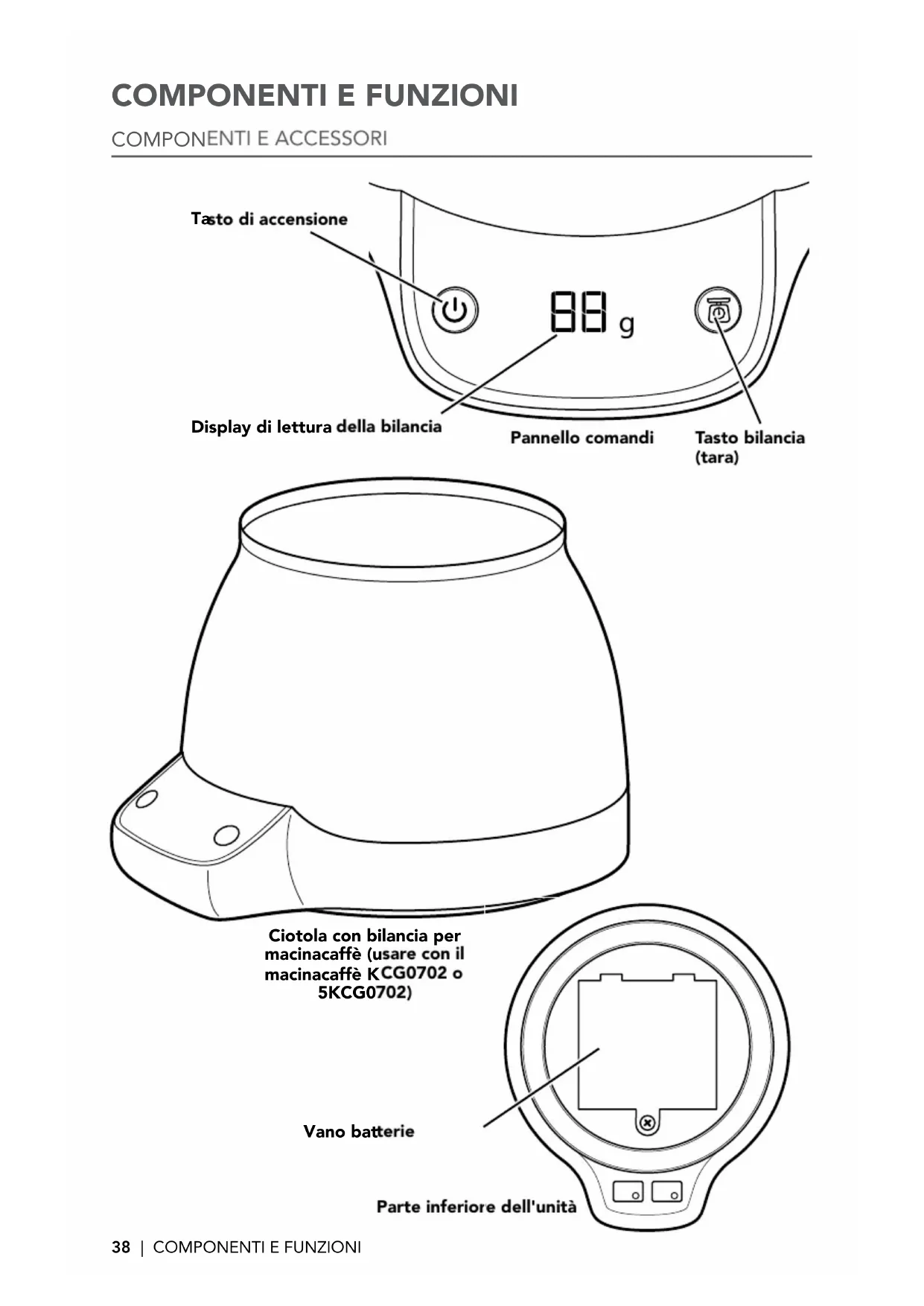 Ciotola con bilancia per macinacaffè (usare con il macinacaffè KCG0702 o 5KCG0702) Vano batterie Pannello comandi Parte inferiore dell'unità Tasto di accensione Display di lettura della bilancia Tasto bilancia (tara)ITALIANO INFORMAZIONI DI SICUREZZA PER LA CIOTOLA CON BILANCIA PER MACINACAFFÈ | 39