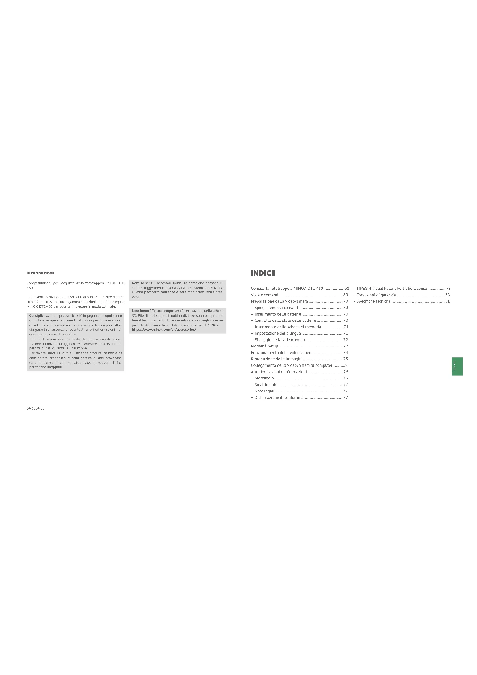 Le presenti istruzioni per l‘uso sono destinate a fornire suppor- to nel familiarizzare con la gamma di opzioni della fototrappola MINOX DTC 460 per poterla impiegare in modo ottimale. Consigli: L‘azienda produttrice si è impegnata da ogni punto di vista a redigere le presenti istruzioni per l‘uso in modo quanto più completo e accurato possibile. Non si può tutta- via garantire l‘assenza di eventuali errori od omissioni nel corso del processo tipografico. Il produttore non risponde né dei danni provocati da tenta- tivi non autorizzati di aggiornare il software, né di eventuali perdite di dati durante la riparazione. Per favore, salva i tuoi file! L‘azienda produttrice non è da considerarsi responsabile della perdita di dati provocata da un apparecchio danneggiato a causa di supporti dati o periferiche illeggibili. Nota bene: Gli accessori forniti in dotazione possono ri- sultare leggermente diversi dalla precedente descrizione. Questo pacchetto potrebbe essere modificato senza prea- vvisi. Nota bene: Eettua sempre una formattazione della scheda SD. File di altri supporti multimediali possono compromet- tere il funzionamento. Ulteriori informazioni sugli accessori per DTC 460 sono disponibili sul sito internet di MINOX: https://www.minox.com/en/accessories/66 6766 67 Italiano
