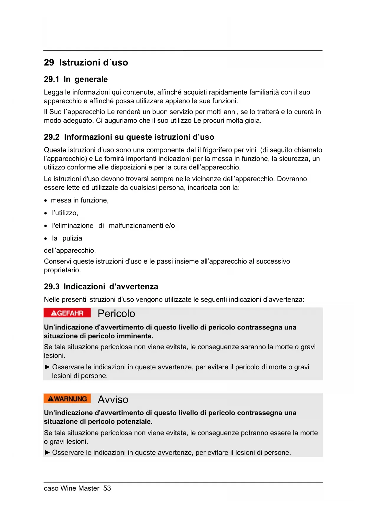 Questo documento è coperto dalla tutela per i diritti d’autore. La Braukmann GmbH si riserva tutti i diritti, anche quelli della riproduzione fotomeccanica, della riproduzione e diffusione mediante particolari procedure (per esempio mediante l'elaborazione dati, supporto dati e reti di dati) anche parziale. Ci si riserva il diritto di effettuare modifiche tecniche e nel contenuto.caso Wine Master 55 30 Sicurezza In questo capitolo riceverà importanti indicazioni sulla sicurezza nell’utilizzo dell’apparecchio. Questo apparecchio corrisponde alle disposizioni di sicurezza prescritte. Un utilizzo inadeguato può però provocare danni a persone e cose.