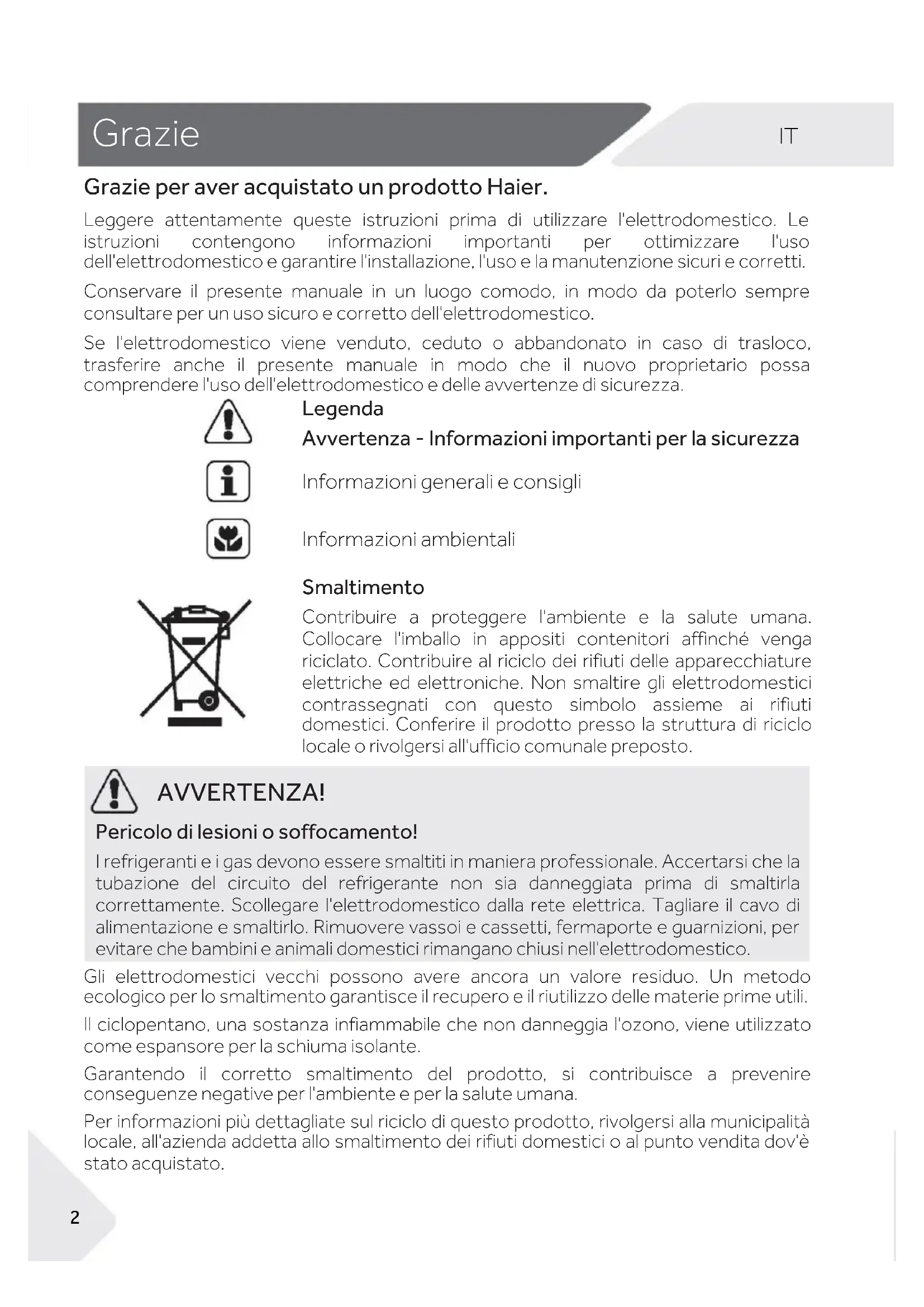 "Grazie Ðõäýìèóèõäùèõäæôøìö÷ä÷òøñóõòçò÷÷òÑäìèõ Leggere attentamente queste istruzioni prima di utilizzare l'elettrodomestico. Le istruzioni contengono informazioni importanti per ottimizzare l'uso dell'elettrodomestico e garantire l'installazione, l'uso e la manutenzione sicuri e corretti. Conservare il presente manuale in un luogo comodo, in modo da poterlo sempre consultare per un uso sicuro e corretto dell'elettrodomestico. Se l'elettrodomestico viene venduto, ceduto o abbandonato in caso di trasloco, trasferire anche il presente manuale in modo che il nuovo proprietario possa comprendere l'uso dell'elettrodomestico e delle avvertenze di sicurezza. Õèêèñçä Êùùèõ÷èñýä¡ Òñéòõðäýìòñììðóòõ÷äñ÷ìóèõïäöìæøõèýýä Informazioni generali e consigli Informazioni ambientali Üðäï÷ìðèñ÷ò Contribuire a proteggere l'ambiente e la salute umana. Collocare l'imballo in appositi contenitori affinché venga riciclato. Contribuire al riciclo dei rifiuti delle apparecchiature elettriche ed elettroniche. Non smaltire gli elettrodomestici contrassegnati con questo simbolo assieme ai rifiuti domestici. Conferire il prodotto presso la struttura di riciclo locale o rivolgersi all'ufficio comunale preposto. ÊßßÎÛÝÎ×ãÊ Ùèõìæòïòçì ïèöìòñìòöòééòæäðèñ÷ò I refrigeranti e i gas devono essere smaltiti in maniera professionale. Accertarsi che la tubazione del circuito del refrigerante non sia danneggiata prima di smaltirla correttamente. Scollegare l'elettrodomestico dalla rete elettrica. Tagliare il cavo di alimentazione e smaltirlo. Rimuovere vassoi e cassetti, fermaporte e guarnizioni, per evitare che bambini e animali domestici rimangano chiusi nell'elettrodomestico. Gli elettrodomestici vecchi possono avere ancora un valore residuo. Un metodoecologico per lo smaltimento garantisce il recupero e il riutilizzo delle materie prime utili.Il ciclopentano, una sostanza infiammabile che non danneggia l'ozono, viene utilizzatocome espansore per la schiuma isolante. Garantendo il corretto smaltimento del prodotto, si contribuisce a prevenire conseguenze negative per l'ambiente e per la salute umana.Per informazioni più dettagliate sul riciclo di questo prodotto, rivolgersi alla municipalità locale, all'azienda addetta allo smaltimento dei rifiuti domestici o al punto vendita dov'è stato acquistato.Informazioni per la sicurezza