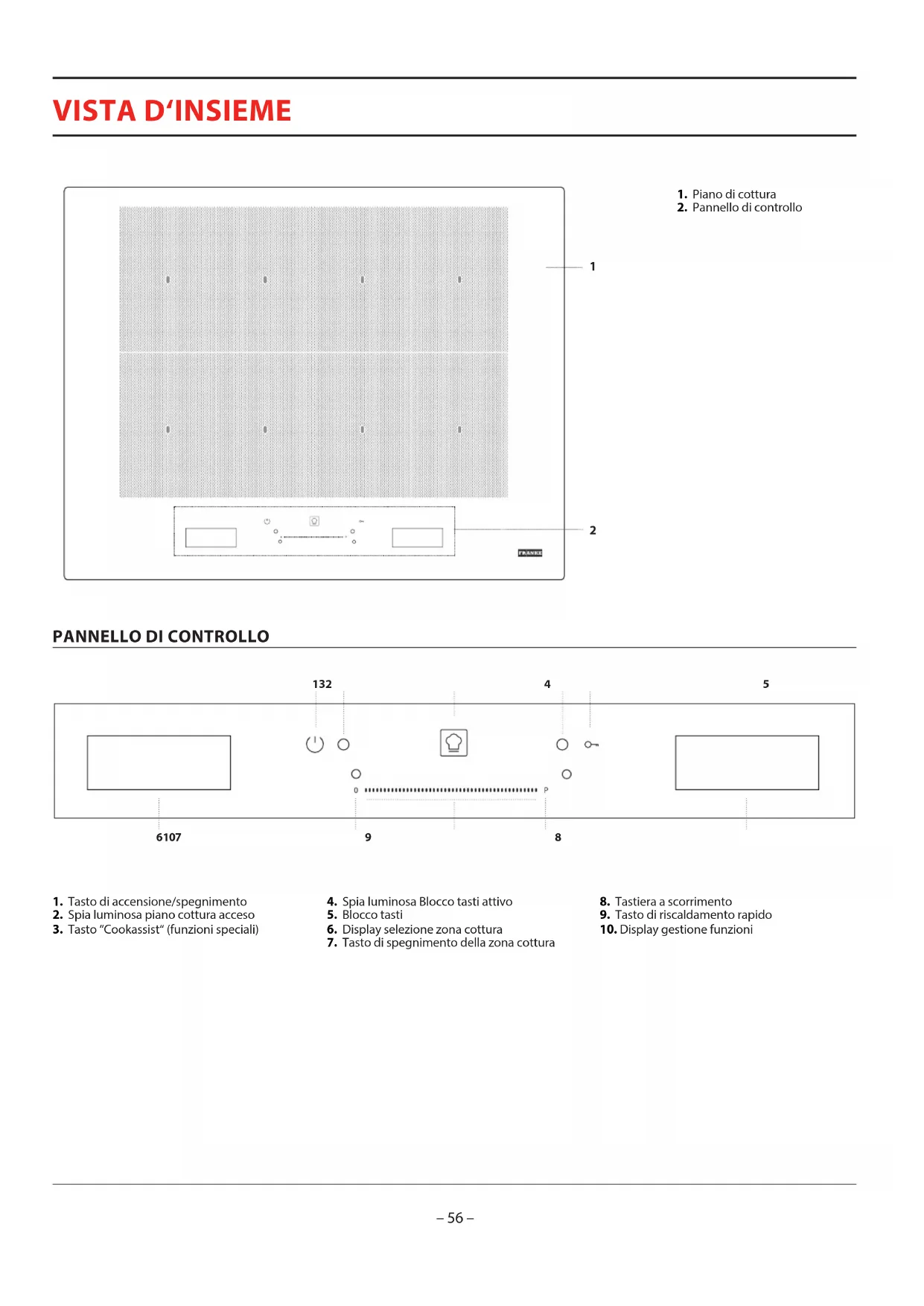 – 51 –– 52 – Prima di utilizzare l’apparecchio, leggere le seguenti norme di sicurezza. Conservarle per eventuali consultazioni successive. Queste istruzioni e l’apparecchio sono corredati da importanti avvertenze di sicurezza, da leggere e osservare sempre. Il fabbricante declina qualsiasi responsabilità che derivi dalla mancata osservanza delle presenti istruzioni di sicurezza, da usi impropri dell’apparecchio o da errate impostazioni dei comandi. ATTENZIONE: Se la supercie presenta crepe, spegnere il dispositivo per evitare la possibilità di una scossa elettrica. AVVERTENZA: Pericolo di incendio: non appoggiare oggetti sulle superci di cottura. ATTENZIONE: Il processo di cottura deve essere sorvegliato. I processi di cottura brevi richiedono una supervisione continua. AVVERTENZA: La cottura non sorvegliata su un piano di cottura con grasso e olio può essere pericolosa e generare incendi. Non tentare MAI di spegnere le amme con acqua: piuttosto, spegnere l’apparecchio e soocare le amme, ad esempio con un coperchio o una coperta antincendio. Non utilizzare il piano di cottura come supercie di lavoro o appoggio. Non avvicinare all’apparecchio stoe o altri materiali inammabili no a che tutti i componenti non si siano completamente rareddati per evitare il rischio di incendi. Non poggiare oggetti metallici come coltelli, forchette, cucchiai e coperchi sulla supercie del piano di cottura perché potrebbero surriscaldarsi. Tenere i bambini di età inferiore a 3 anni lontani dall’apparecchio. Senza la sorveglianza costante di un adulto tenere anche l’apparecchio fuori dalla portata dei bambini di età compresa tra 3 e 8 anni. I bambini di età superiore agli 8 anni, le persone con ridotte capacità siche, sensoriali o mentali e le persone che non abbiano esperienza o conoscenza dell’apparecchio potranno utilizzarlo solo sotto sorveglianza, o quando siano state istruite sull’utilizzo sicuro dell’apparecchio e siano consapevoli dei rischi del suo utilizzo. Vietare ai bambini di giocare con l’apparecchio. I bambini non devono eseguire operazioni di pulizia e manutenzione dell’apparecchio senza la sorveglianza di un adulto. Dopo l’uso, spegnere l’elemento del piano di cottura mediante il rispettivo comando e non fare adamento sul rilevatore di tegami. ATTENZIONE: L'apparecchio e i suoi componenti accessibili possono diventare molto caldi durante l'uso. Fare attenzione a non toccare gli elementi riscaldanti. Tenere lontani i bambini di età inferiore agli 8 anni, a meno che non siano costantemente sorvegliati. USO CONSENTITO ATTENZIONE: l’apparecchio non è destinato ad essere messo in funzione mediante un dispositivo di commutazione esterno, ad esempio un temporizzatore, o attraverso un sistema di comando a distanza separato. L’apparecchio è destinato all’uso domestico e ad applicazioni analoghe, quali: aree di cucina per il personale di negozi, uci e altri contesti lavorativi; agriturismi; camere di hotel, motel, bed & breakfast e altri ambienti residenziali. Non sono consentiti altri usi (ad es., il riscaldamento di ambienti). Questo apparecchio non è destinato ad applicazioni professionali. Non utilizzare l’apparecchio all’aperto. INSTALLAZIONE Per evitare il rischio di lesioni personali, l’apparecchio deve essere movimentato e installato da due o più persone. Per le operazioni di disimballaggio e installazione utilizzare i guanti protettivi per non procurarsi tagli. L’installazione, comprendente anche eventuali raccordi per l’alimentazione idrica e i collegamenti elettrici, e gli interventi di riparazione devono essere eseguiti da personale qualicato. Non riparare o sostituire qualsiasi parte dell’apparecchio se non specicatamente richiesto nel manuale d’uso. Tenere i bambini a distanza dal luogo dell’installazione. Dopo aver disimballato l’apparecchio, controllare che l’apparecchio non sia stato danneggiato durante il trasporto. In caso di problemi, contattare il rivenditore o il Servizio Assistenza Clienti. A installazione completata, conservare il materiale di imballaggio (parti in plastica, polistirolo, ecc.) fuori della portata dei bambini per evitare il rischio di soocamento. Per evitare rischi di scosse elettriche, prima di procedere all’installazione scollegare l’apparecchio dalla rete elettrica. Durante l’installazione, accertarsi che l’apparecchio non possa danneggiare il cavo di alimentazione e causare così rischi di scosse elettriche. Attivare l’apparecchio solo dopo avere completato la procedura di installazione. Eseguire tutte le operazioni di taglio del mobile prima di inserire l’apparecchio, avendo cura di rimuovere trucioli o residui di segatura. Se l’apparecchio non è installato sopra un forno, è necessario installare un pannello divisorio (non in dotazione) nel vano sottostante.