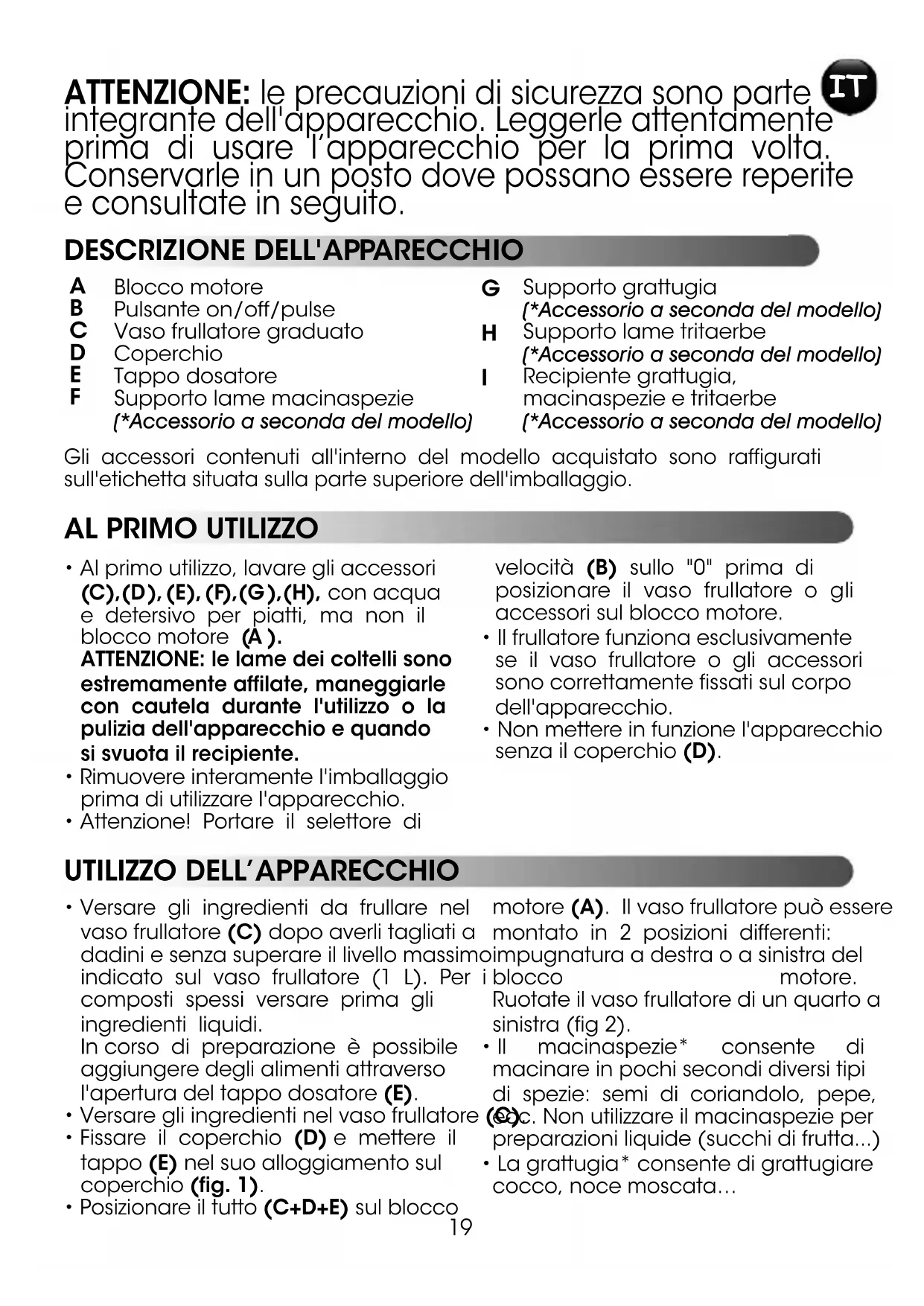 ATTENZIONE: le precauzioni di sicurezza sono parte integrante dell'apparecchio. Leggerle attentamente prima di usare l’apparecchio per la prima volta. Conservarle in un posto dove possano essere reperite e consultate in seguito. SM_BLENDER_UNO_EO_8080013792_Mise en page 1 12/06/14 10:21 Page1920