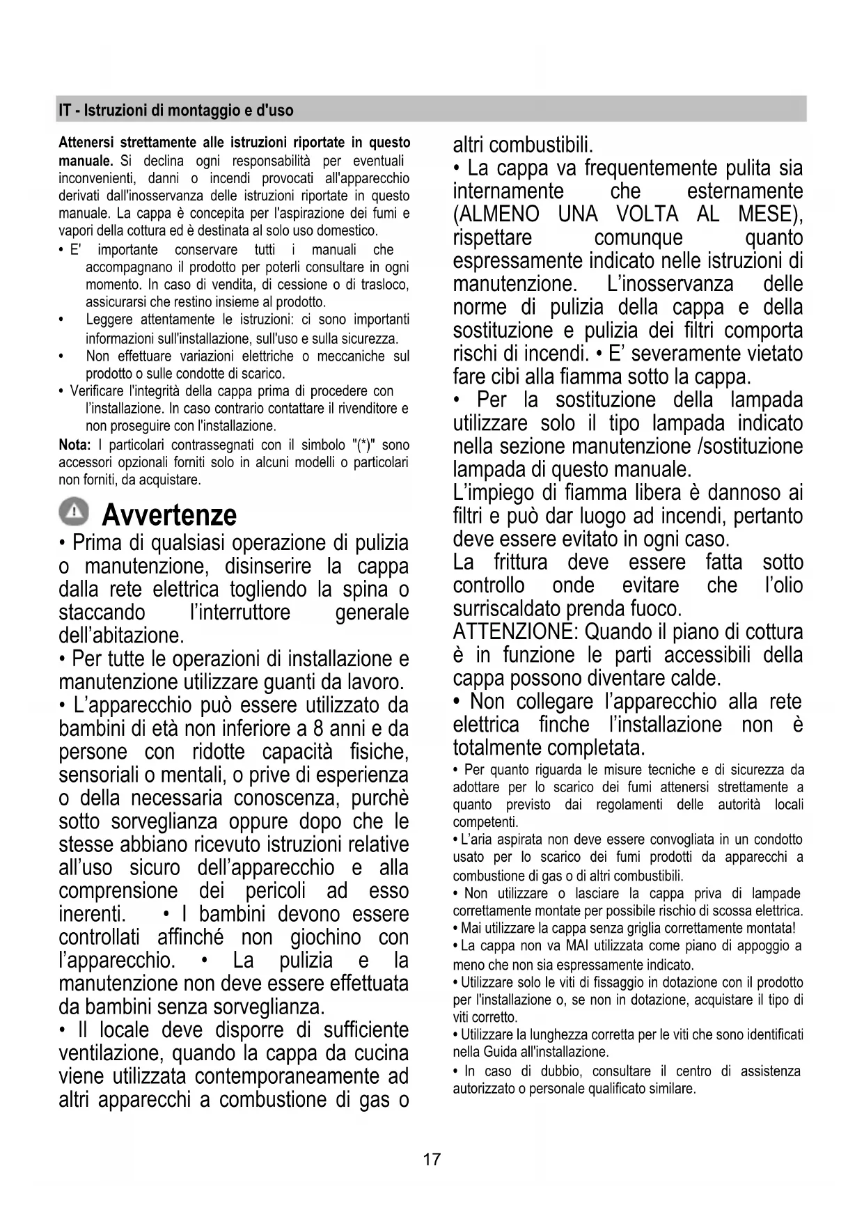 RU СМОТРИТЕ ВИДЕОРУКОВОДСТВО ПО УСТАНОВКЕ17 IT - Istruzioni di montaggio e d'uso Attenersi strettamente alle istruzioni riportate in questo manuale. Si declina ogni responsabilità per eventuali inconvenienti, danni o incendi provocati all'apparecchio derivati dall'inosservanza delle istruzioni riportate in questo manuale. La cappa è concepita per l'aspirazione dei fumi e vapori della cottura ed è destinata al solo uso domestico.