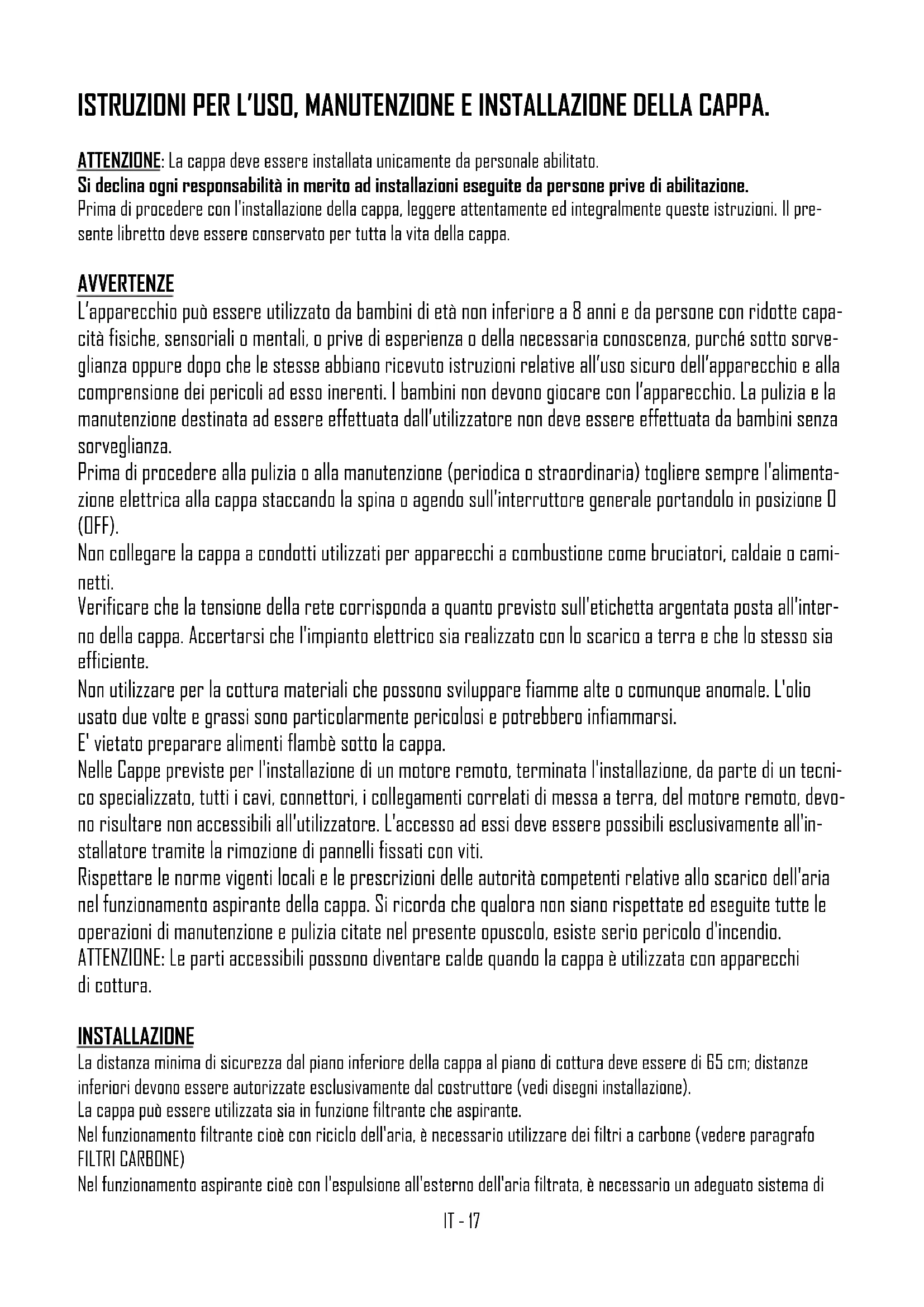Attenzione: Prima di procedere con l’installazione, accertarsi che le viti e i tasselli forniti in dotazione, siano idonei per il tipo di parete in cui deve essere fissata la cappa. Per il montaggio della cappa utilizzare gli accessori in dotazione e seguire le fasi illustrate nel foglio allegato. ALLACCIAMENTO ELETTRICO L'allacciamento elettrico deve essere effettuato da personale specializzato, nel rispetto delle norme e leggi vigenti. Verificare che la tensione della rete corrisponda a quella indicata sull'etichetta argentata posta all'interno della cappa. Accertarsi che l'impianto sia realizzato secondo le norme vigenti e con lo scarico a terra efficiente. Porre particolare attenzione al cavo di alimentazione della cappa, verificando che non attraversi fori sprovvisti di passacavo. Nel caso di collegamento diretto alla rete, è necessario prevedere un dispositivo che assicuri la discon- nessione dalla rete, con una distanza di apertura dei contatti che consenta la disconnessione completa nelle condizio- ni della categoria di sovratensione III, conformemente alle regole di installazione. La spina o l'interruttore onnipolare devono essere accessibili ad apparecchio installato. Se il cavo di alimentazione è danneggiato, esso deve essere sostituito con un cavo speciale oppure un assieme disponibili presso il costruttore o il suo servizio assistenza tecni- ca. Il cavo da utilizzare deve essere di tipo H05VV-F con sezione minima 3 x 0,75mm². Il costruttore declina ogni responsabilità nel caso non vengano rispettate le norme antinfortunistiche vigenti, necessarie al regolare funzionamento dell'impianto elettrico. COMANDI COMANDO PUSH BOTTON (Fig. 1) Nella versione con comando pulsantiera sono presenti quattro pulsanti. > Un pulsante per accensione e spegnimento delle luci. > Un pulsante per accensione in 1^ velocità e spegnimento del motore. > Un pulsante per accensione 2^ velocità. > Un pulsante per accensione 3^ velocità.IT - 19 COMANDO SOFT TOUCH (Fig. 2) Nella versione con comando soft touch sono presenti quattro pulsanti a sfioramento ed un led a colore variabile (verde min. velocità, rosso max. velocità). > Un pulsante per accensione e spegnimento delle luci. > Un pulsante per accensione in 2^ velocità e spegnimento del motore. N.B. Tenendo premuto questo tasto per più di tre secondi, si attiva la funzione di autospegnimento dopo 10 minuti, il led lampeggia lentamente. > Due pulsanti + e - per aumento e riduzione delle velocità motore. Alla 4^ velocità del motore (intensiva) il led lam- peggia velocemente e dopo 5min. viene impostata automaticamente la 2^ velocità. COMANDO DIGITALE \ TOUCH CONTROL (Fig. 3) Nella versione con comando digitale sono presenti cinque pulsanti a sfioramento ed un display. > Un pulsante per accensione e spegnimento delle luci. > Un pulsante per accensione in 2^ velocità e spegnimento del motore. > Due pulsanti + e - per aumento e riduzione delle velocità motore. Alla 4^ velocità del motore (intensiva) il numero presente nel display lampeggia e dopo 5min. viene impostata automaticamente la 2^ velocità. > Un pulsante TIMER per spegnimento del motore dopo 10 min. con il timer attivato, il numero presente nel display sarà lampeggiante Funzioni speciali: Dopo 100 ore di utilizzo sul DISPLAY inizierà a lampeggiare lo 0 oppure la lettera A per segnalare l'esigenza di lavare i filtri metallici. Dopo aver lavato i filtri metallici, azzerare il conta ore tenendo premuto il tasto TIMER per più di tre sec. con cappa spenta. La visualizzazione dell'avvenuto azzeramento viene segnalata mediante la comparsa, a cappa spenta, di un trattino sul display. COMANDO RADIO-CONTROL ( Fig. 4) Il tasto ON/OFF sulla cappa, accende simultaneamente le luci e il motore alla seconda velocità oppure spegne tutto. Dopo 100 ore di funzionamento del motore aspirante, inizierà a lampeggiare il led rosso a segnalare l’esigenza di lavare i filtri metallici. Per annullare l’allarme filtri, è necessario tenere premuto a lungo il tasto ON/OFF sulla cappa con motore spento. Telecomando: al primo utilizzo è necessario avviare l’apprendimento del telecomando. A cappa spenta, tenere premuto 3-8 sec. il tasto ON/OFF (DISTANTE - CEILING STRIPE) o il tasto “+” (AIDA) sulla cappa. L'apprendimento del telecomando viene segnalato con il led allarme rosso lampeggiante. Se entro un minuto arriva un codice telecomando valido (inviato premendo qualunque tasto del telecomando), il led diventa acceso fisso per 3 secondi per poi spegnersi, segnalando il corretto apprendimento. Tasti telecomando: > Un tasto per accensione e spegnimento delle luci. > Un tasto per accensione in 2^ velocità e spegnimento del motore. > Due tasti + e - per aumento e riduzione delle velocità motore. Alla 4^ velocità del motore (intensiva) il led lampeggia e dopo 5min. viene impostata automaticamente la 2^ velocità. > Un tasto TIMER per spegnimento del motore dopo 10 min.IT - 20
