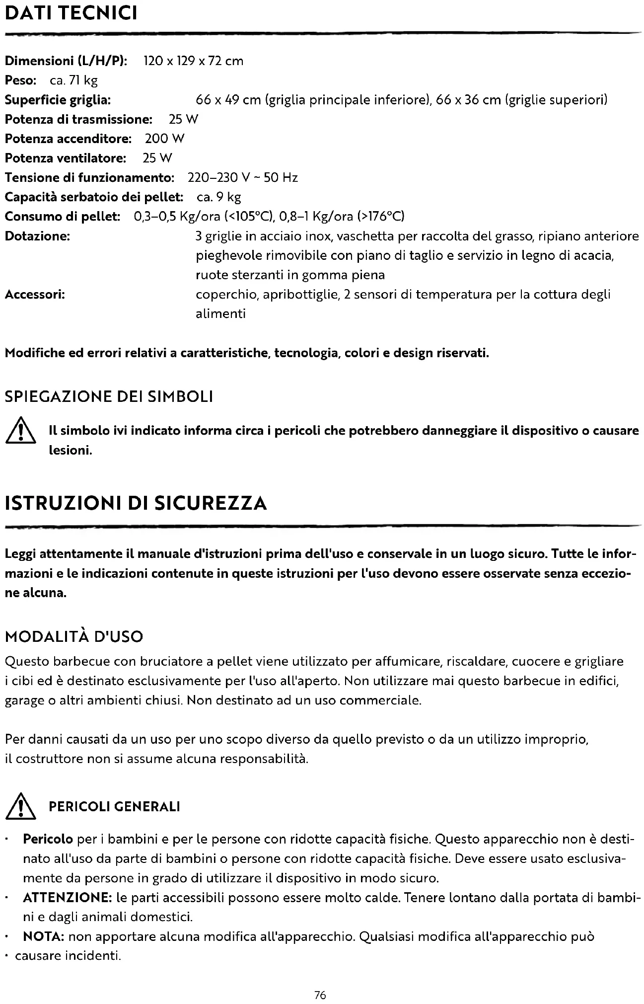 Leggi attentamente il manuale d'istruzioni prima dell'uso e conservale in un luogo sicuro. Tutte le infor- mazioni e le indicazioni contenute in queste istruzioni per l'uso devono essere osservate senza eccezio- ne alcuna. MODALITÀ D'USO Questo barbecue con bruciatore a pellet viene utilizzato per affumicare, riscaldare, cuocere e grigliare i cibi ed è destinato esclusivamente per l'uso all'aperto. Non utilizzare mai questo barbecue in edifici, garage o altri ambienti chiusi. Non destinato ad un uso commerciale. Per danni causati da un uso per uno scopo diverso da quello previsto o da un utilizzo improprio, il costruttore non si assume alcuna responsabilità.