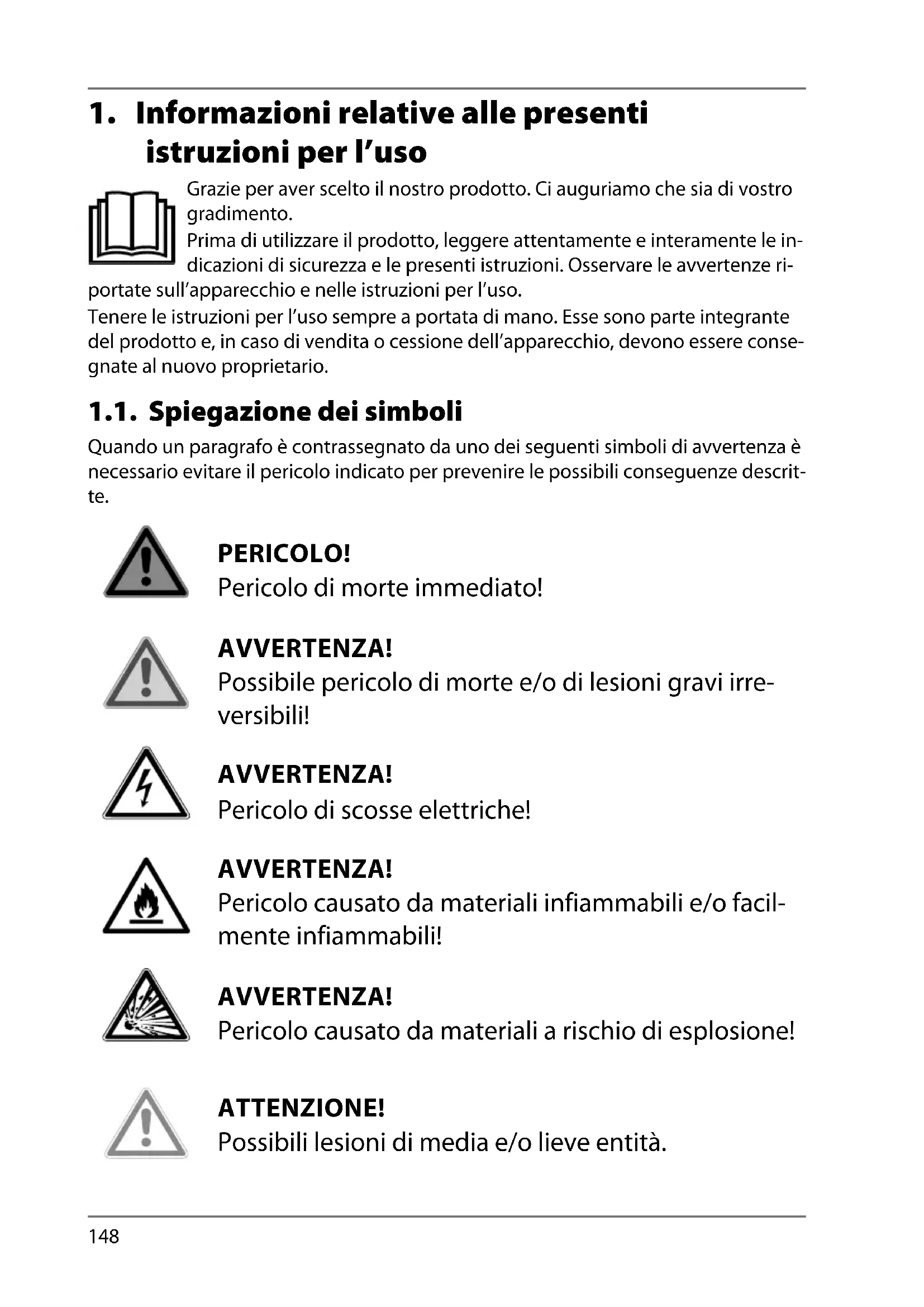 istruzioni per l’uso Grazie per aver scelto il nostro prodotto. Ci auguriamo che sia di vostro gradimento. Prima di utilizzare il prodotto, leggere attentamente e interamente le in- dicazioni di sicurezza e le presenti istruzioni. Osservare le avvertenze ri- portate sull’apparecchio e nelle istruzioni per l’uso. Tenere le istruzioni per l’uso sempre a portata di mano. Esse sono parte integrante del prodotto e, in caso di vendita o cessione dell’apparecchio, devono essere conse- gnate al nuovo proprietario. 1.1. Spiegazione dei simboli Quando un paragrafo è contrassegnato da uno dei seguenti simboli di avvertenza è necessario evitare il pericolo indicato per prevenire le possibili conseguenze descrit- te. PERICOLO! Pericolo di morte immediato! AVVERTENZA! Possibile pericolo di morte e/o di lesioni gravi irre- versibili! AVVERTENZA! Pericolo di scosse elettriche! AVVERTENZA! Pericolo causato da materiali infiammabili e/o facil- mente infiammabili! AVVERTENZA! Pericolo causato da materiali a rischio di esplosione! ATTENZIONE! Possibili lesioni di media e/o lieve entità.DE