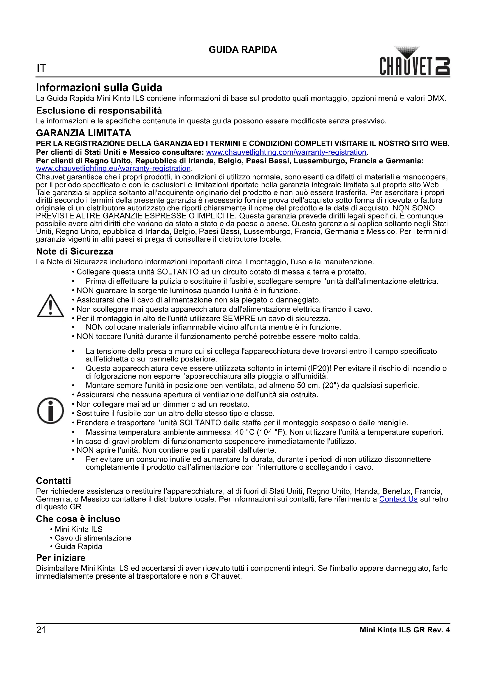 Chauvet garantisce che i propri prodotti, in condizioni di utilizzo normale, sono esenti da difetti di materiali e manodopera, per il periodo specificato e con le esclusioni e limitazioni riportate nella garanzia integrale limitata sul proprio sito Web. Tale garanzia si applica soltanto all'acquirente originario del prodotto e non può essere trasferita. Per esercitare i propri diritti secondo i termini della presente garanzia è necessario fornire prova dell'acquisto sotto forma di ricevuta o fattura originale di un distributore autorizzato che riporti chiaramente il nome del prodotto e la data di acquisto. NON SONO PREVISTE ALTRE GARANZIE ESPRESSE O IMPLICITE. Questa garanzia prevede diritti legali specifici. È comunque possibile avere altri diritti che variano da stato a stato e da paese a paese. Questa garanzia si applica soltanto negli Stati Uniti, Regno Unito, epubblica di Irlanda, Belgio, Paesi Bassi, Lussemburgo, Francia, Germania e Messico. Per i termini di garanzia vigenti in altri paesi si prega di consultare il distributore locale. Note di Sicurezza Le Note di Sicurezza includono informazioni importanti circa il montaggio, l'uso e la manutenzione. Contatti Per richiedere assistenza o restituire l'apparecchiatura, al di fuori di Stati Uniti, Regno Unito, Irlanda, Benelux, Francia, Germania, o Messico contattare il distributore locale. Per informazioni sui contatti, fare riferimento a Contact Us sul retro di questo GR. Che cosa è incluso Per iniziare Disimballare Mini Kinta ILS ed accertarsi di aver ricevuto tutti i componenti integri. Se l'imballo appare danneggiato, farlo immediatamente presente al trasportatore e non a Chauvet.