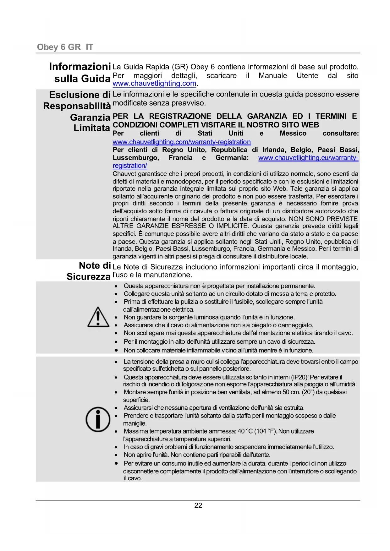 La Guida Rapida (GR) Obey 6 contiene informazioni di base sul prodotto. Per maggiori dettagli, scaricare il Manuale Utente dal sito www.chauvetlighting.com. Esclusione di Responsabilità Le informazioni e le specifiche contenute in questa guida possono essere modificate senza preavviso. Garanzia Limitata