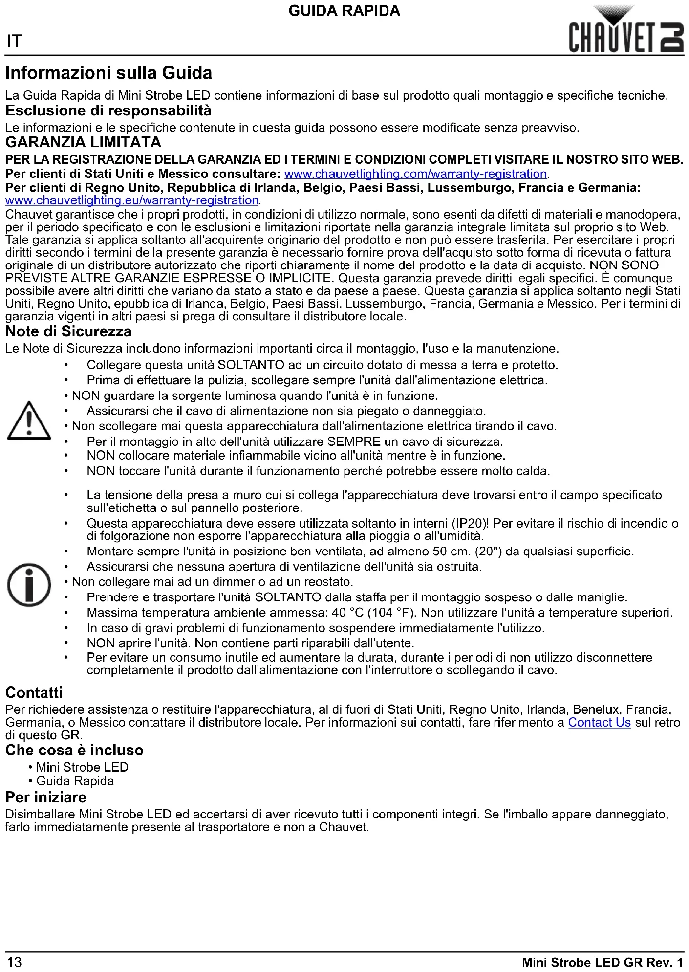 Chauvet garantisce che i propri prodotti, in condizioni di utilizzo normale, sono esenti da difetti di materiali e manodopera, per il periodo specificato e con le esclusioni e limitazioni riportate nella garanzia integrale limitata sul proprio sito Web. Tale garanzia si applica soltanto all'acquirente originario del prodotto e non può essere trasferita. Per esercitare i propri diritti secondo i termini della presente garanzia è necessario fornire prova dell'acquisto sotto forma di ricevuta o fattura originale di un distributore autorizzato che riporti chiaramente il nome del prodotto e la data di acquisto. NON SONO PREVISTE ALTRE GARANZIE ESPRESSE O IMPLICITE. Questa garanzia prevede diritti legali specifici. È comunque possibile avere altri diritti che variano da stato a stato e da paese a paese. Questa garanzia si applica soltanto negli Stati Uniti, Regno Unito, epubblica di Irlanda, Belgio, Paesi Bassi, Lussemburgo, Francia, Germania e Messico. Per i termini di garanzia vigenti in altri paesi si prega di consultare il distributore locale. Note di Sicurezza Le Note di Sicurezza includono informazioni importanti circa il montaggio, l'uso e la manutenzione. Contatti Per richiedere assistenza o restituire l'apparecchiatura, al di fuori di Stati Uniti, Regno Unito, Irlanda, Benelux, Francia, Germania, o Messico contattare il distributore locale. Per informazioni sui contatti, fare riferimento a Contact Us sul retro di questo GR. Che cosa è incluso Per iniziare Disimballare Mini Strobe LED ed accertarsi di aver ricevuto tutti i componenti integri. Se l'imballo appare danneggiato, farlo immediatamente presente al trasportatore e non a Chauvet.