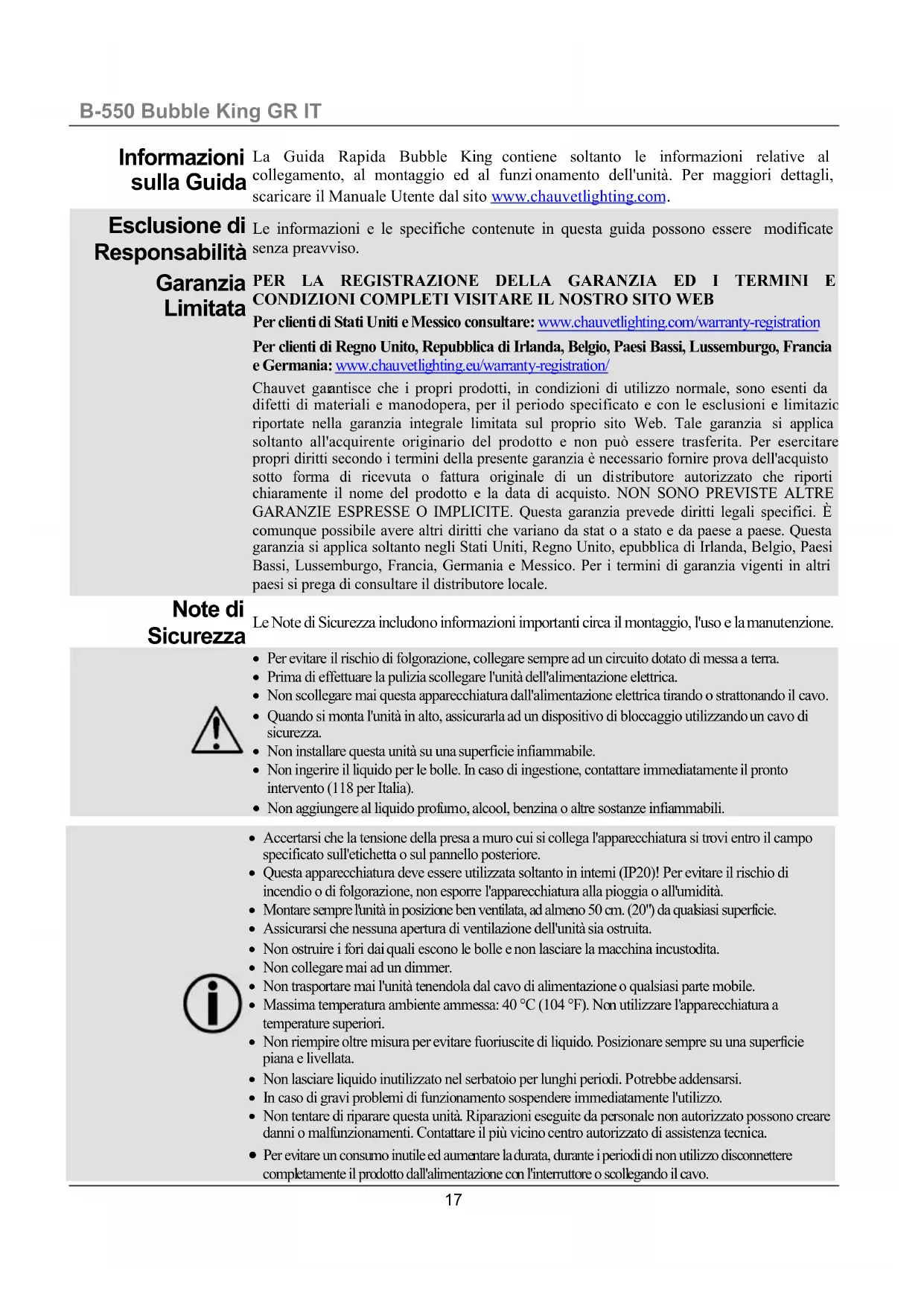 La Guida Rapida Bubble King contiene soltanto le informazioni relative al collegamento, al montaggio ed al funzi onamento dell'unità. Per maggiori dettagli, scaricare il Manuale Utente dal sito www.chauvetlighting.com. Esclusion e di Responsabilità Le informazioni e le specifiche contenute in questa guida possono essere modificate senza preavviso. Garanzia Limitata