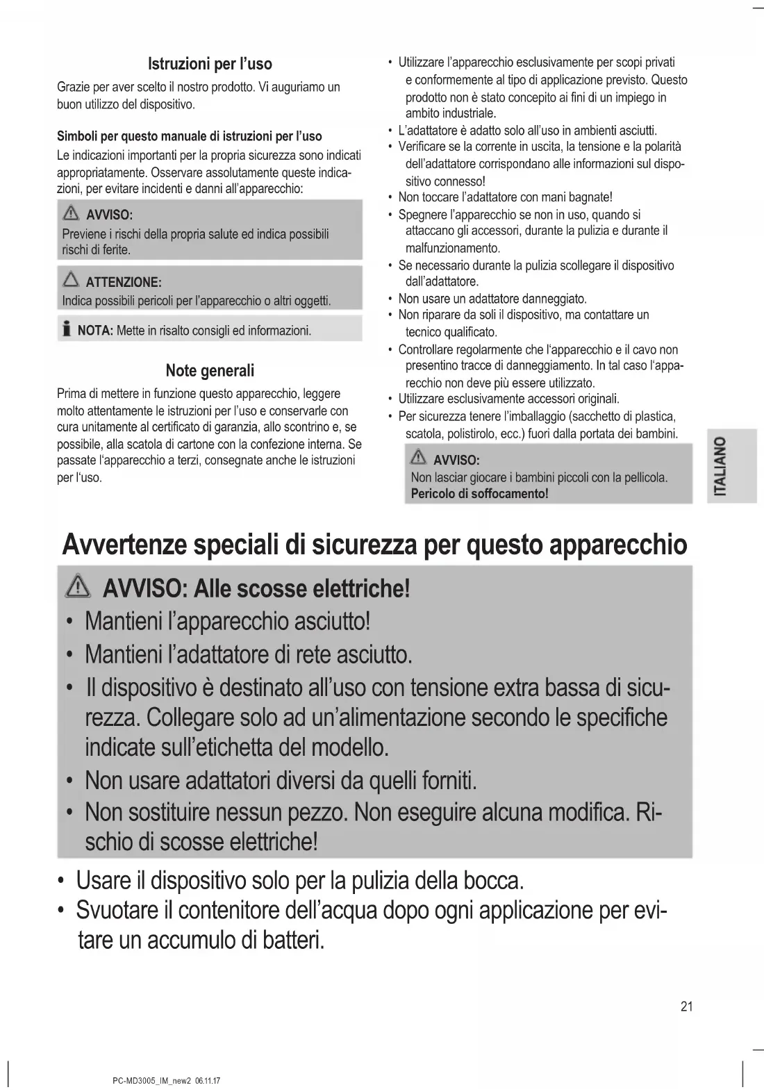 dispositivo. Restituirlo immediatamente al rivenditore. NOTA: Sull‘apparecchio possono esserci ancora tracce di polvere o residui di produzione. Consigliamo di pulire l’apparecchio come descritto in “Pulizia”. Note per l’uso Interruttore di accensione / spegnimento (Doppia funzione) L’interruttore di accensione / spegnimento del dispositivo ha 2 funzioni: Premendo: Il dispositivo si accende Ruotando: Viene regolata la pressione dell’acqua Interruttore di arresto dell’acqua Usare questo interruttore per interrompere momentanea- mente l’applicazione. Lo spegnimento avviene automatica- mente. La pompa del dispositivo continuerà a funzionare. Posizione I dell’interruttore: L’acqua scorre Posizione O dell’interruttore: L’acqua si ferma NOTA: Se non si desidera usare il dispositivo, ruotare sempre l‘interruttore in posizione O. Ugelli 4 ugelli con segni colorati diversi sono contenuti nella forni- tura. Questi possono essere assegnati a diversi utenti. Le ugelli sono situate nel coperchio del dispositivo.23 PC-MD3005_IM_new2 06.11.17 Se le gengive sanguinano ... Le gengive possono sanguinare se si usa l’irrigatore orale per i primi minuti. Se le gengive continuano a sanguinare, contattare il dentista. Funzionamento iniziale